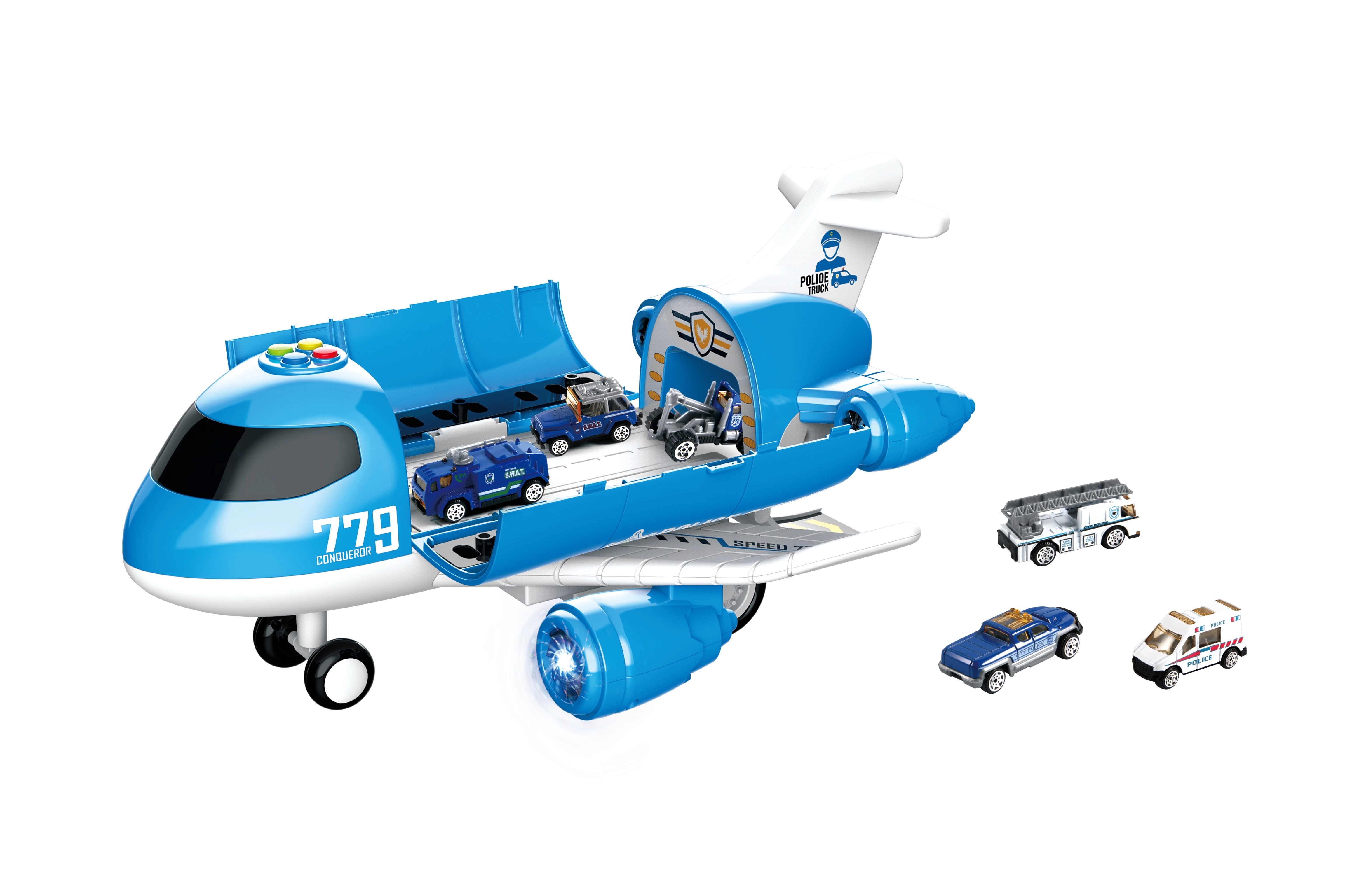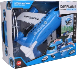 ¡Despega hacia el cielo con un set de juego que encantará a cualquier pequeño piloto! El gran avión de 40 cm ofrece efectos de luz y sonido, mecanismo de inercia para un desplazamiento suave y una rampa trasera abatible para la carga. El paquete incluye 6 coches con ruedas libres. Juguete ideal para niños a partir de 3 años que desarrolla la imaginación y la motricidad.