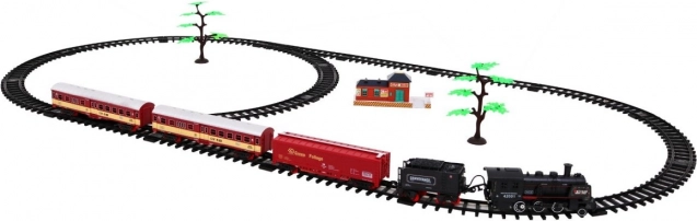 Este impresionante modelo de tren crea la atmósfera perfecta de un ferrocarril real con sus efectos de humo y su locomotora iluminada. El circuito, de aproximadamente 78 cm x 156 cm, ofrece un óvalo con dos desvíos.