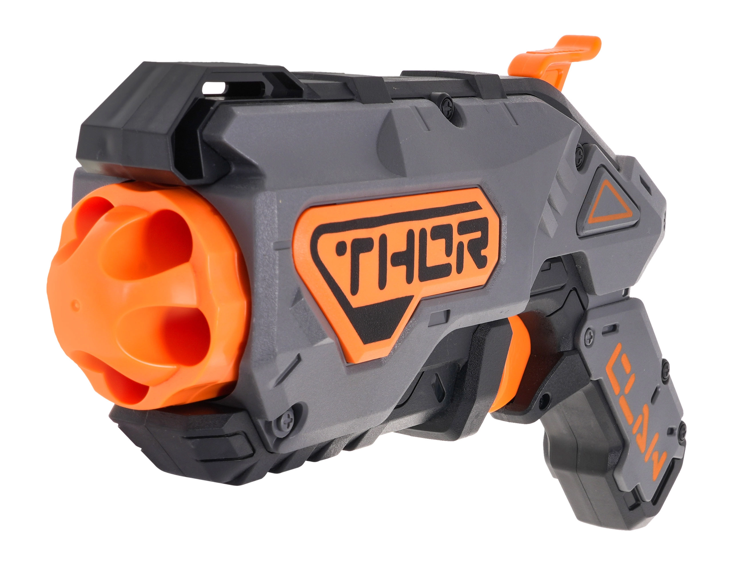 El bláster Blaze Storm está diseñado con un estilo futurista que encantará tanto a niños como a adultos. Su elegante diseño en gris y naranja aporta un aspecto moderno al producto.