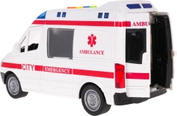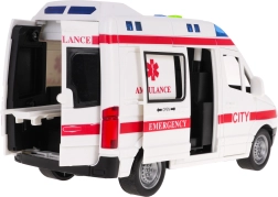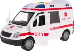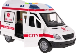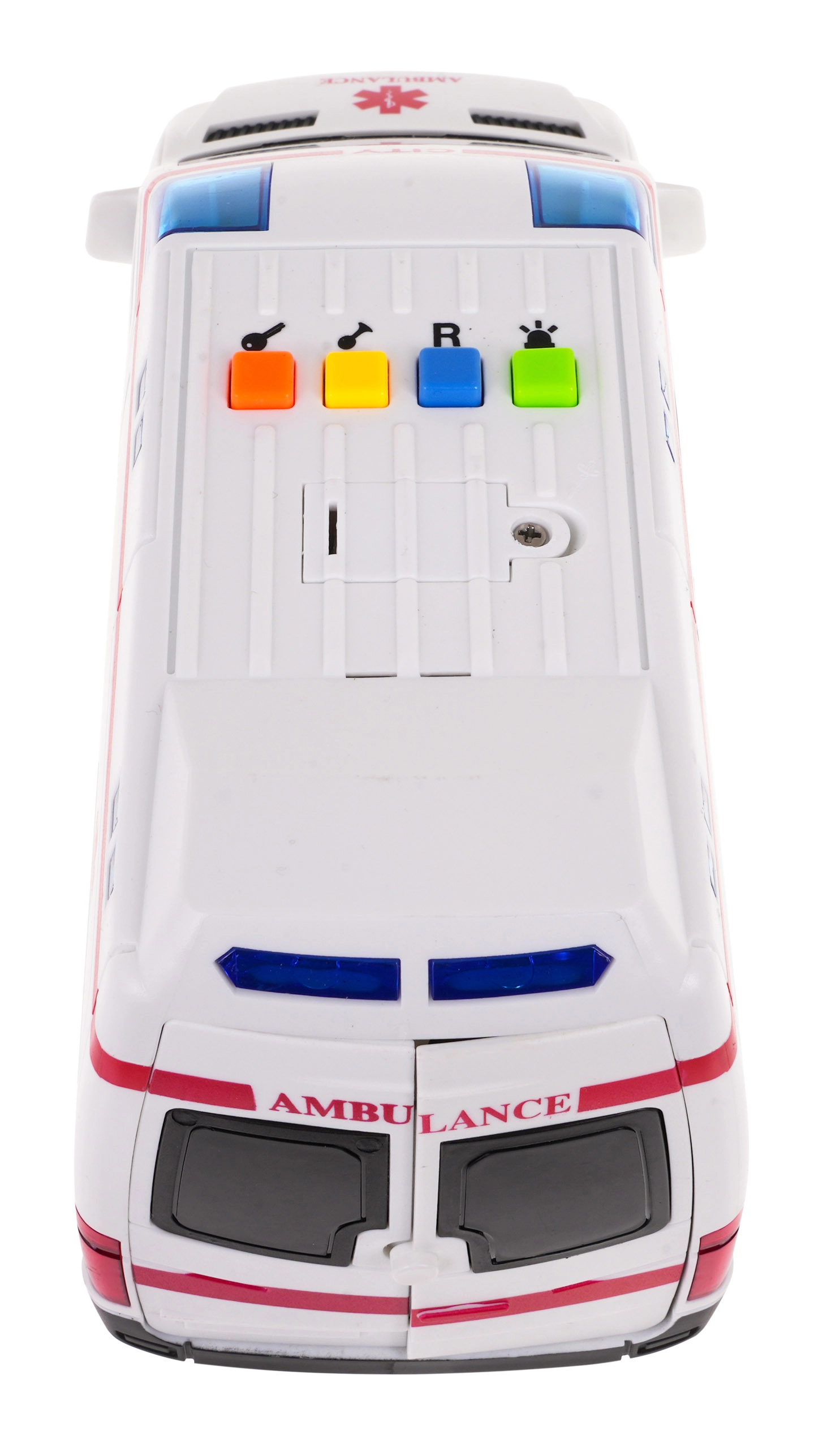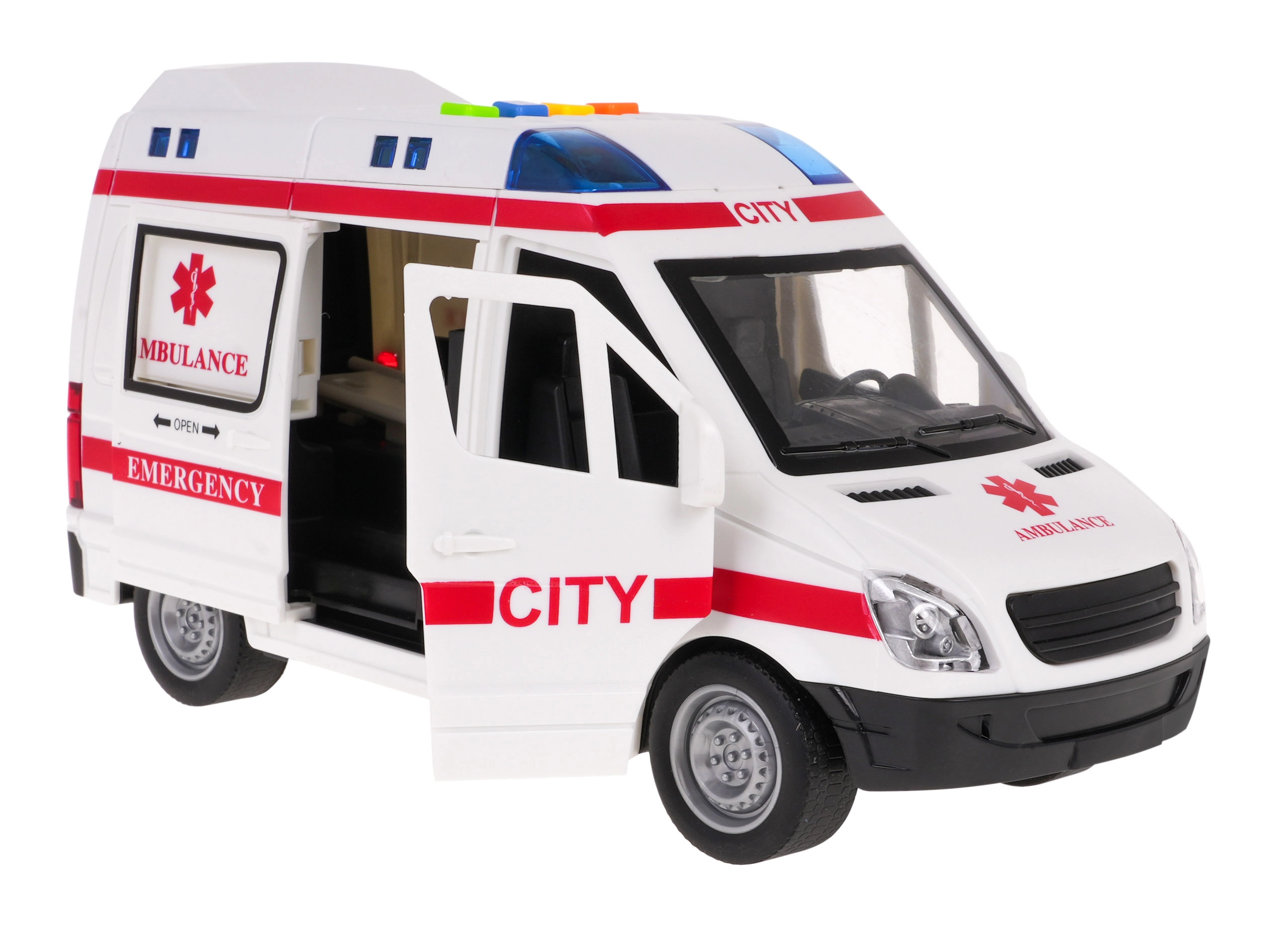 Esta ambulancia infantil detallada ofrece una experiencia de juego auténtica. Al pulsar los botones de colores en el techo se activan el arranque del motor, el claxon, la señal de advertencia y la sirena de emergencia, durante los cuales parpadean las balizas. Las puertas delanteras y traseras abatibles, así como la puerta lateral corredera, amplían los escenarios de juego y estimulan la imaginación.