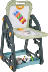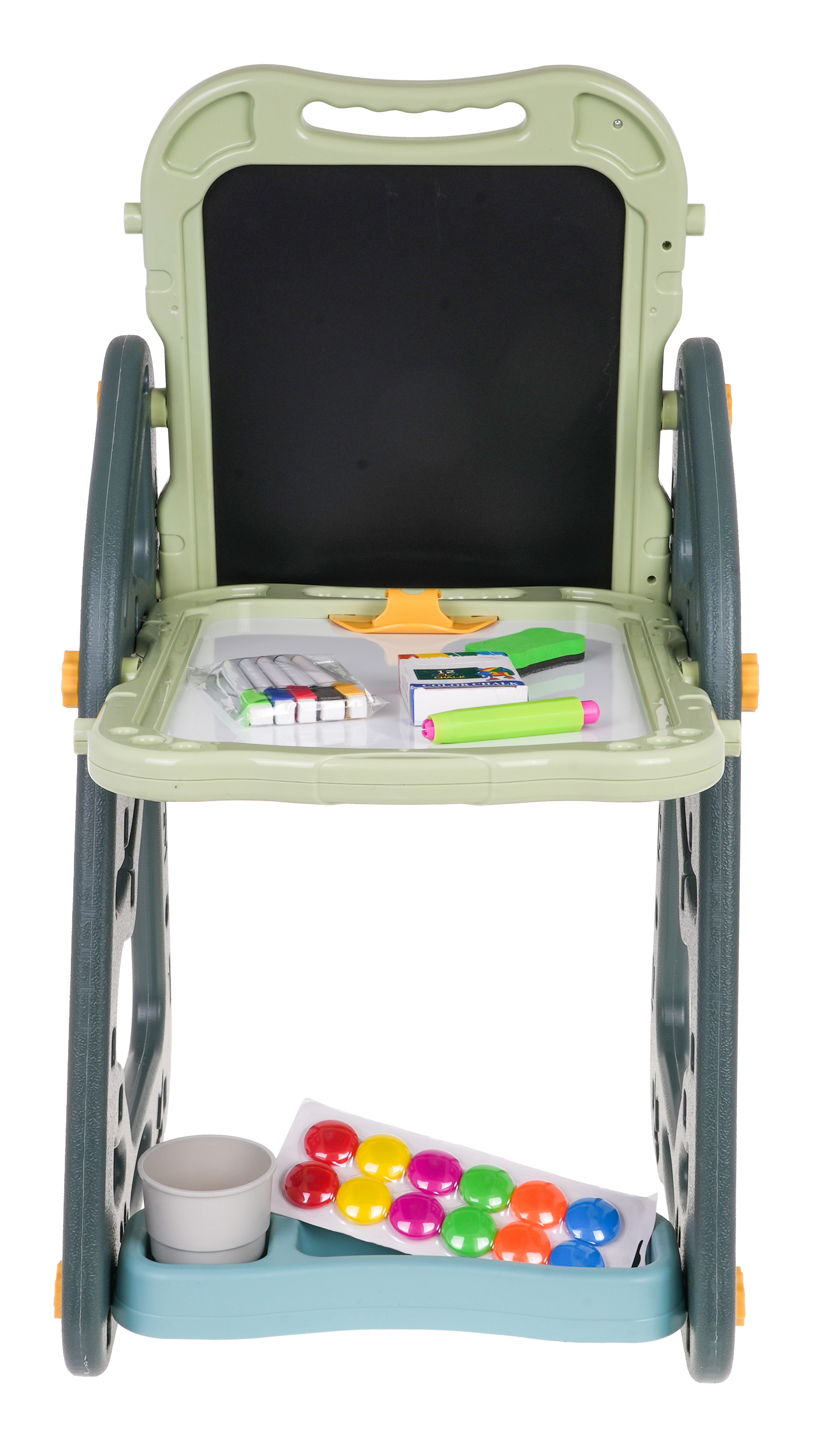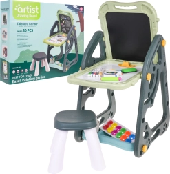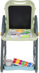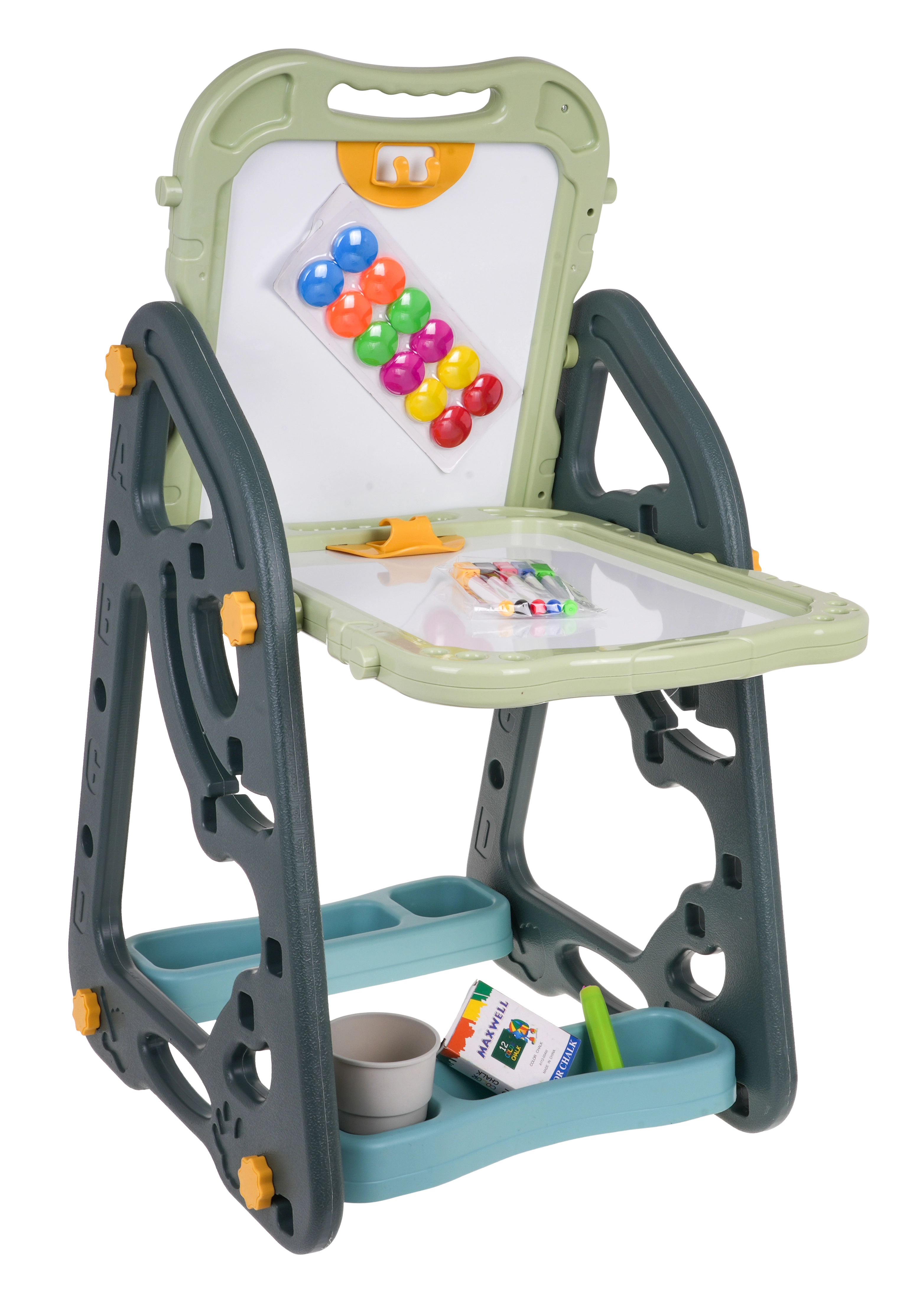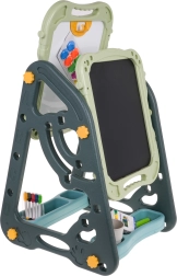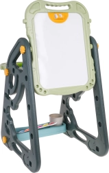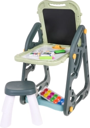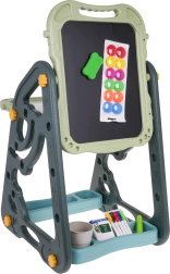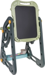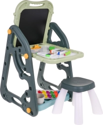 El gran set multifuncional consta de dos pizarras: de tiza y magnética, junto con un cómodo taburete, y es la opción ideal para niños a partir de 3 años. Permite ajustar la pizarra en dos posiciones: por un lado magnética, por el otro de tiza, o como mesa con superficie para dibujar. En el lado blanco se puede escribir con rotuladores o colocar imanes de colores, mientras que el lado negro está destinado a dibujar con tiza. El set también incluye dos estantes para materiales de arte.
