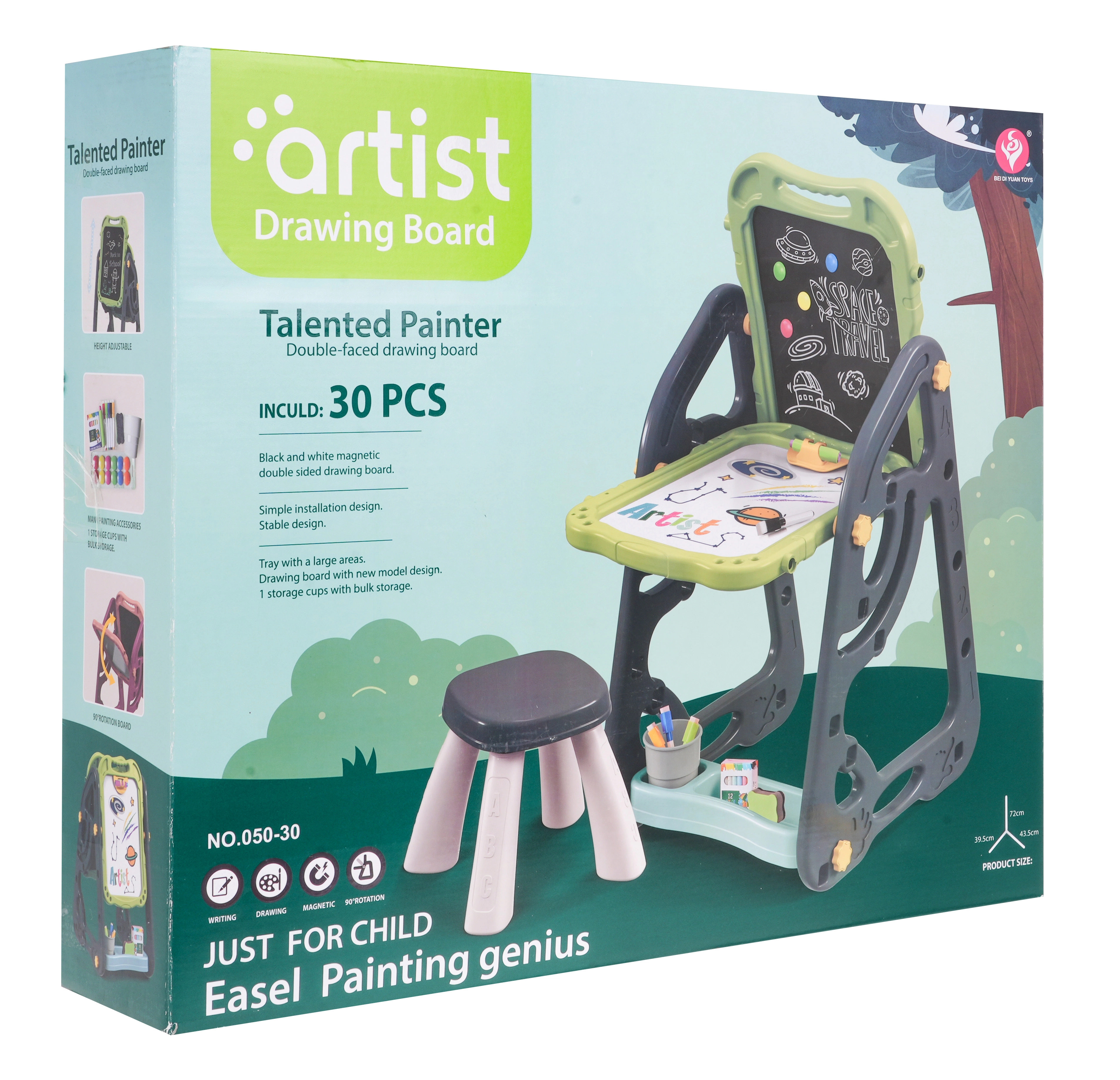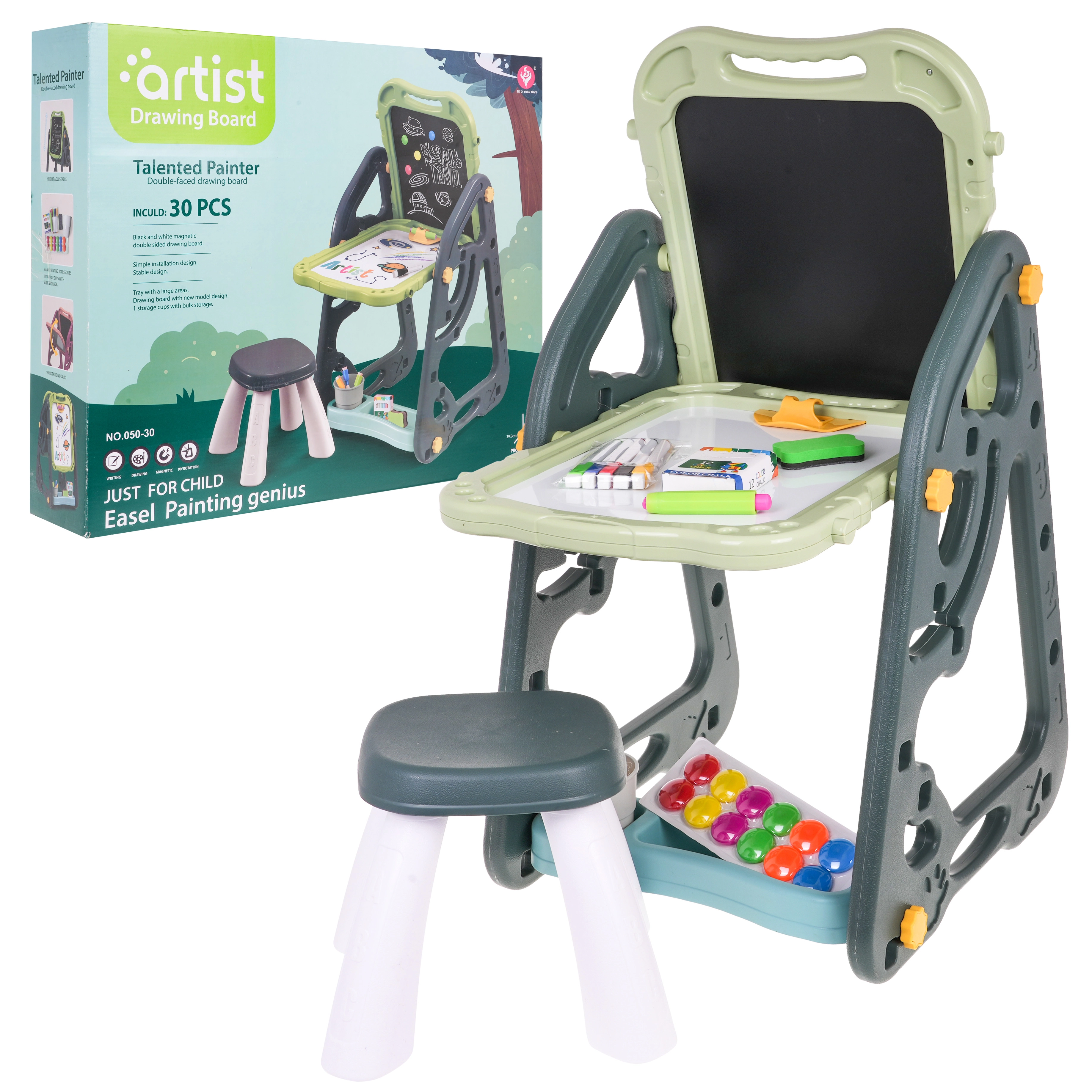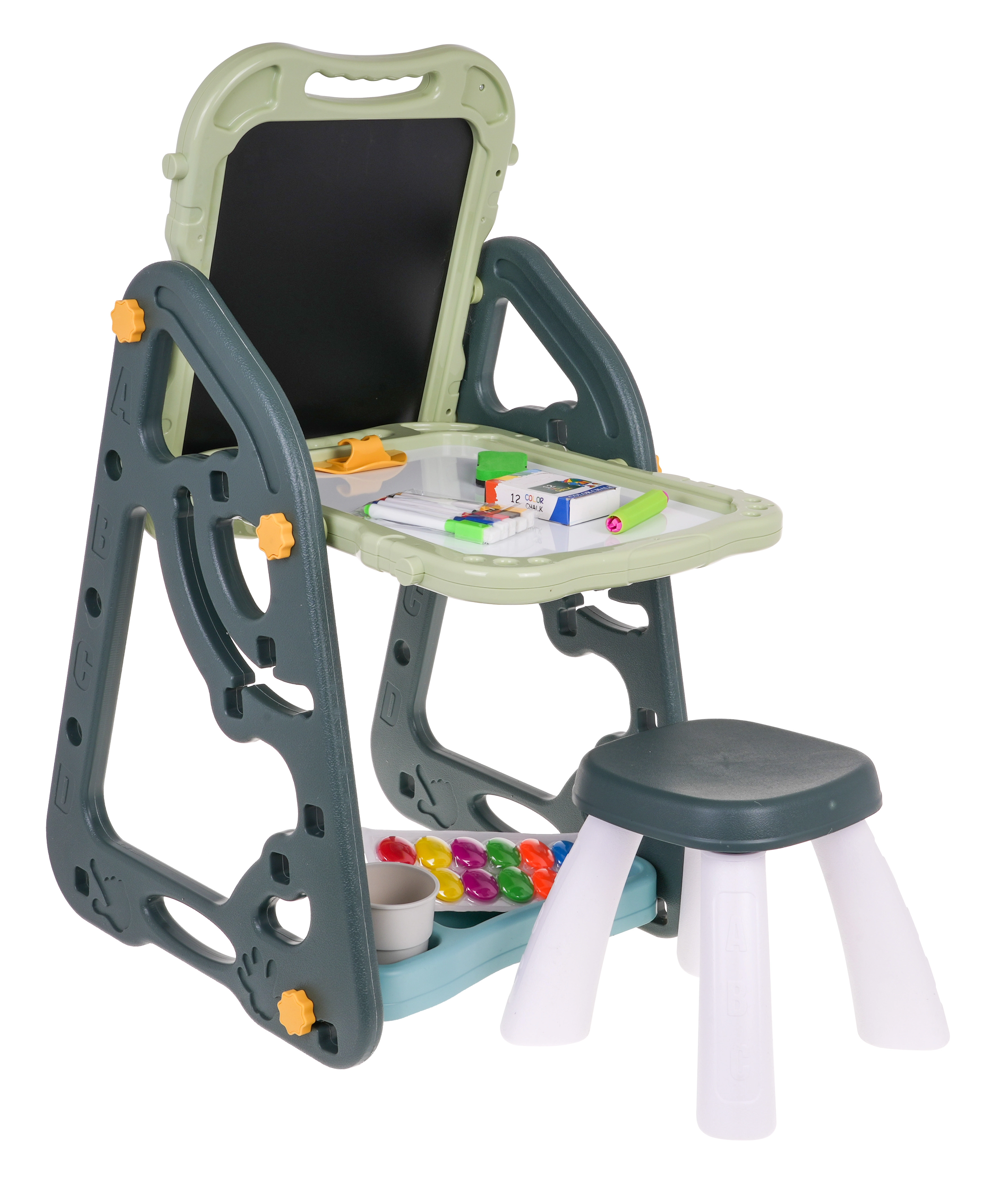 El gran set multifuncional consta de dos pizarras: de tiza y magnética, junto con un cómodo taburete, y es la opción ideal para niños a partir de 3 años. Permite ajustar la pizarra en dos posiciones: por un lado magnética, por el otro de tiza, o como mesa con superficie para dibujar. En el lado blanco se puede escribir con rotuladores o colocar imanes de colores, mientras que el lado negro está destinado a dibujar con tiza. El set también incluye dos estantes para materiales de arte.