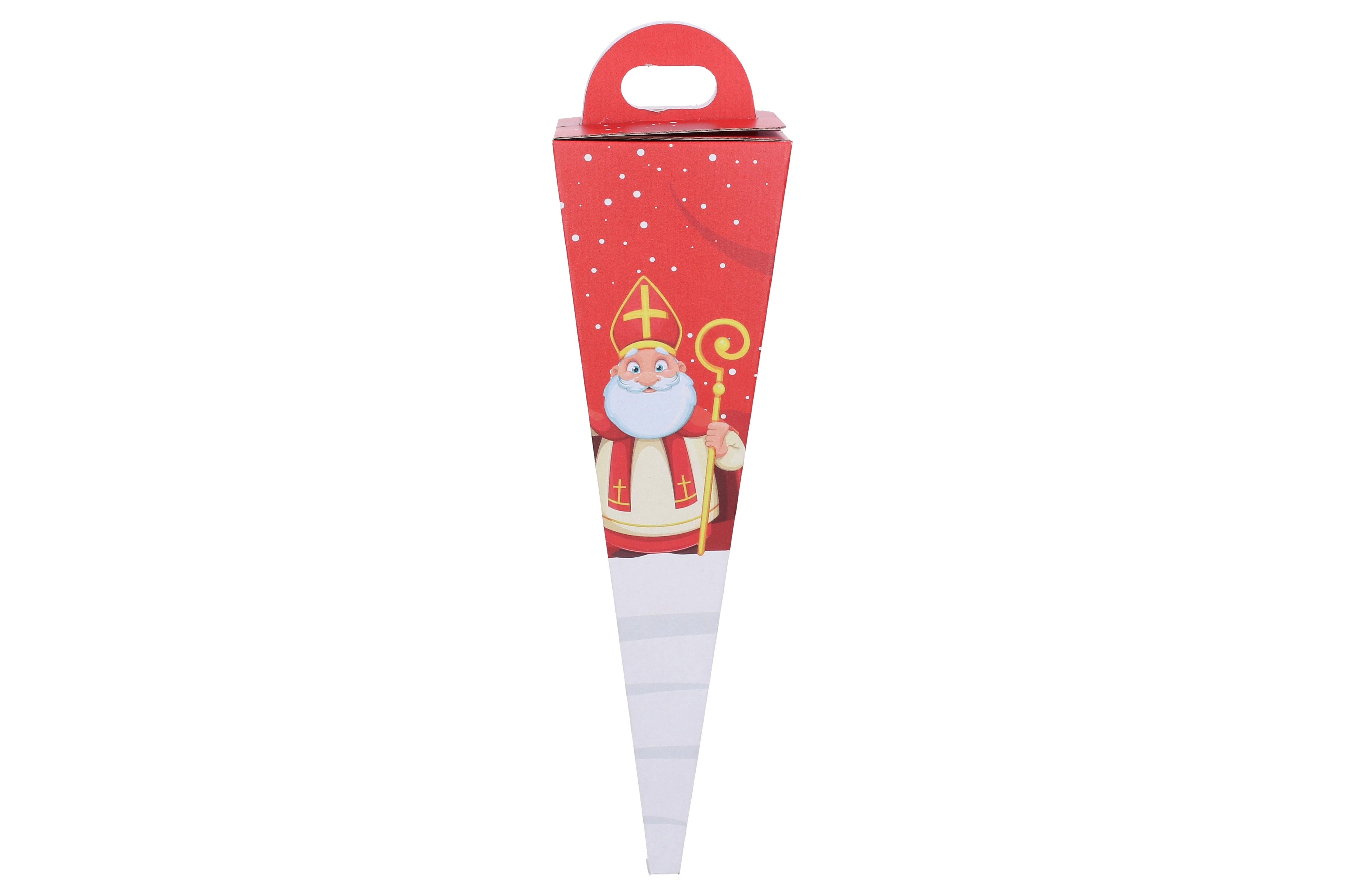 Tradicional cono rojo con motivo de San Nicolás de 50 cm, ideal para envolver obsequios de San Nicolás. Ofrece espacio suficiente para dulces y pequeños regalos y, gracias a su color llamativo, destaca maravillosamente. Una gran elección para padres y escuelas que buscan una solución de embalaje práctica, resistente y estética.