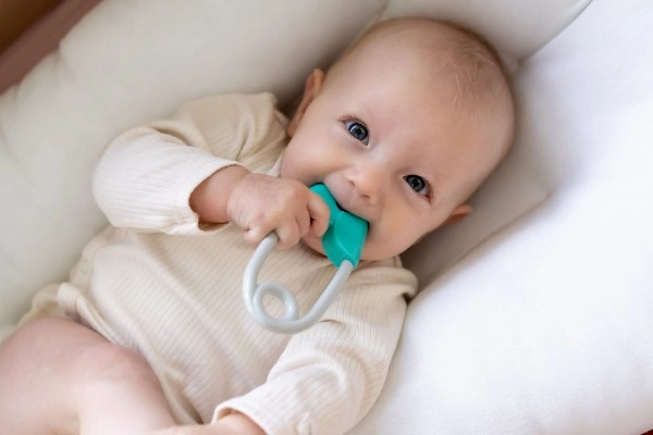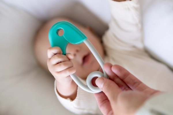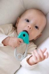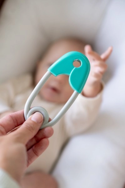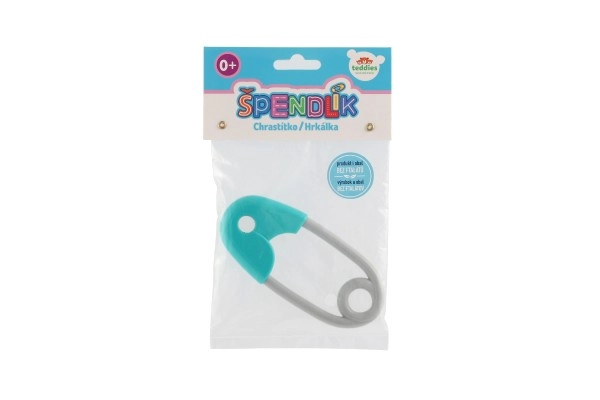 El sonajero con forma de imperdible es una pieza imprescindible para el desarrollo de todo bebé. Está diseñado para ajustarse perfectamente a manos pequeñas, con un acabado en turquesa y gris que estimula la percepción visual del niño. El sonajero incorpora pequeñas bolitas que, al moverlo, suenan suavemente, lo que mantiene la atención del bebé y favorece el desarrollo de la audición.