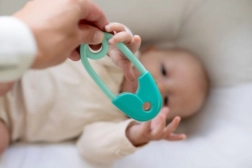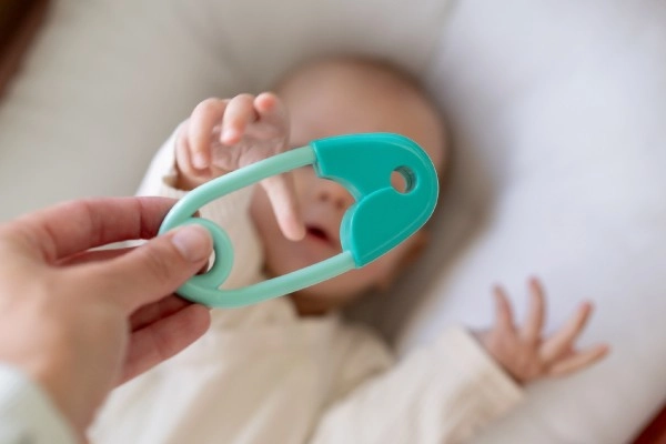 Los bordes grandes y redondeados del imperdible garantizan que el juguete sea completamente seguro para su uso desde el nacimiento.