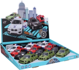 Están disponibles 4 variantes de diseño — bomberos, militar, policía SWAT y coche de policía blanco — ideales para colección o como regalo. El modelo tiene unas dimensiones compactas de 13 × 6 × 6 cm y, gracias a la propulsión por inercia, avanza fácilmente tras impulsarlo.