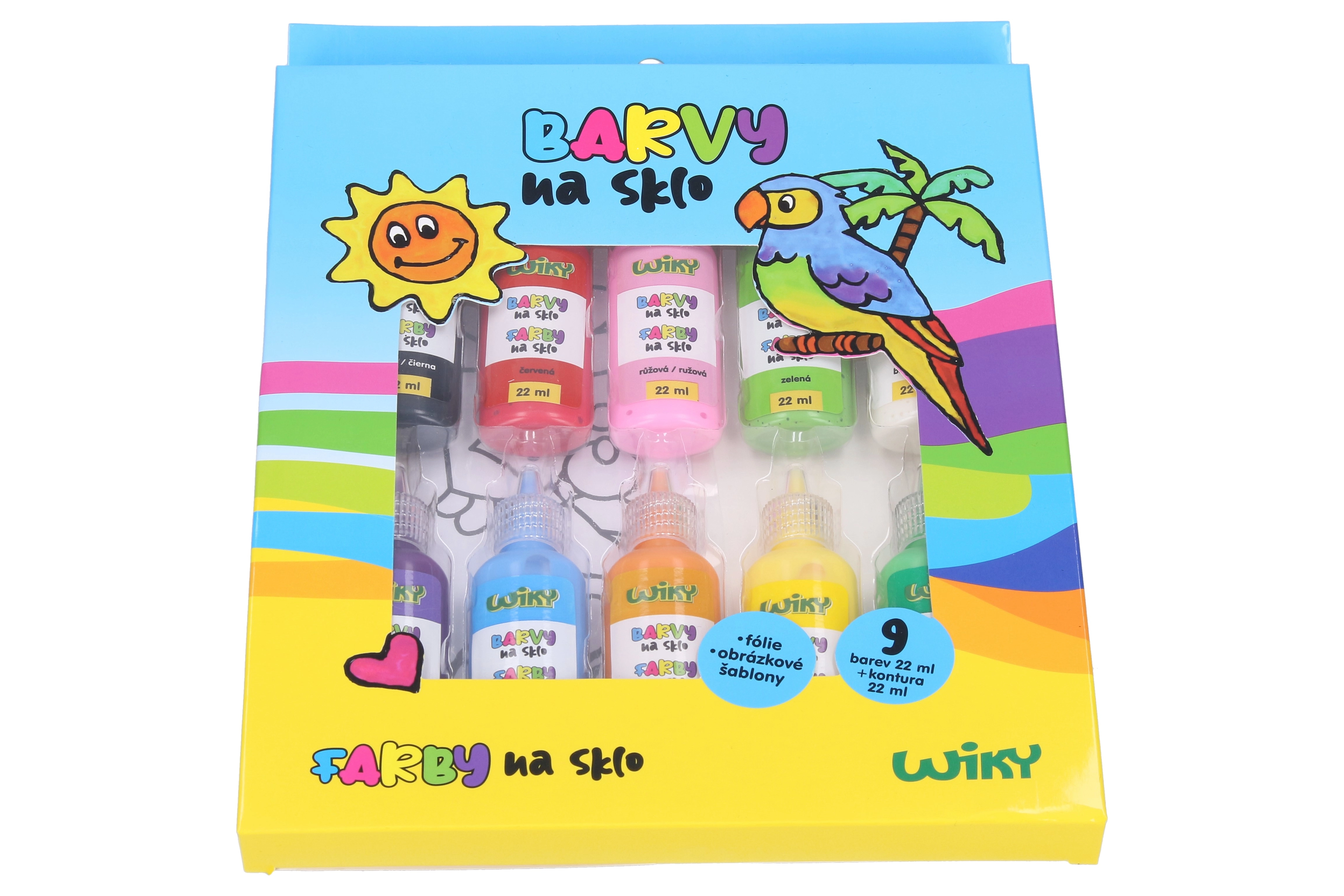 Disfruta con este conjunto de pinturas para vidrio, que contiene nueve colores diferentes, incluyendo rojo, rosa, verde, blanco, violeta, azul claro, naranja, amarillo y verde oscuro. Cada color tiene un volumen de 22 ml y se complementa con un contorno negro del mismo volumen. El set también incluye dos láminas y plantillas con imágenes que te ayudarán a crear tus propios diseños.