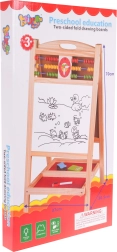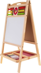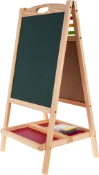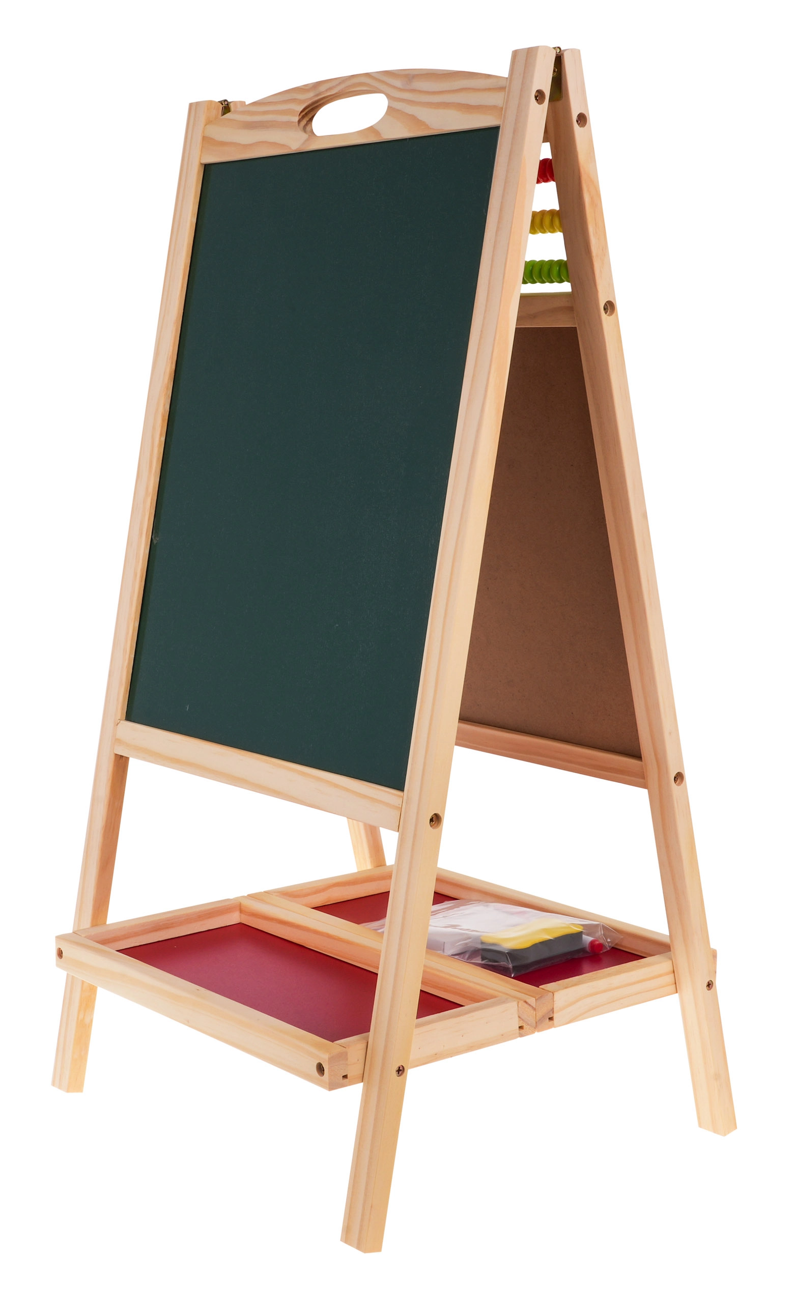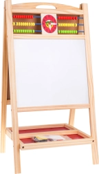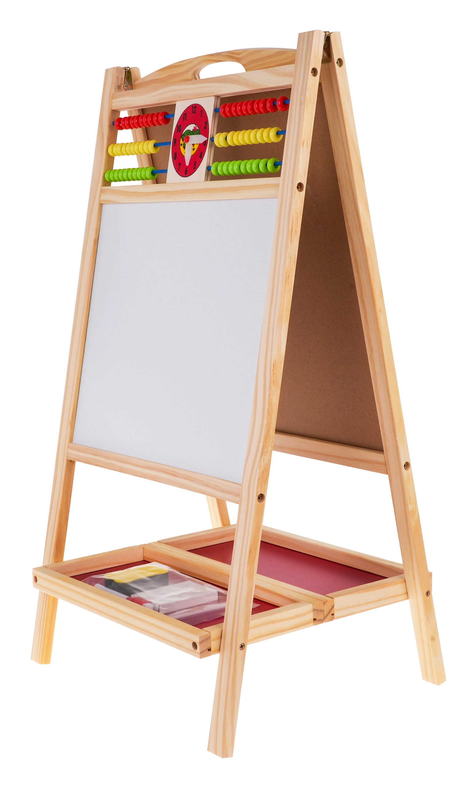 Esta pizarra de pie multifuncional de madera combina una superficie blanca magnética y una clásica de tiza, para que los niños puedan escribir, dibujar y aprender sus primeras letras y números. La parte superior incluye un ábaco y un reloj con manecillas móviles, que fomentan de manera natural el cálculo y la orientación temporal.