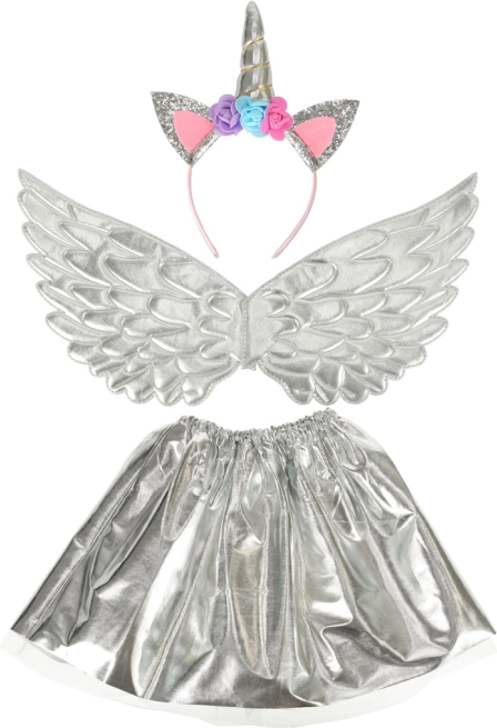Este hermoso disfraz te permitirá transformar a tu hijo en un unicornio único. Consta de una falda plateada, elegantes alas y una diadema cuidadosamente elaborada con florecillas. Ideal para cualquier ocasión en la que el niño pueda disfrutar de un juego de fantasía.