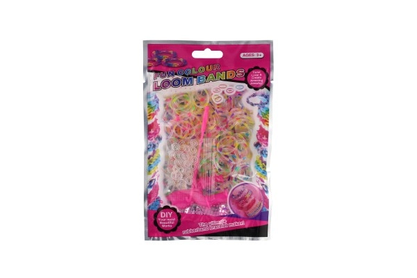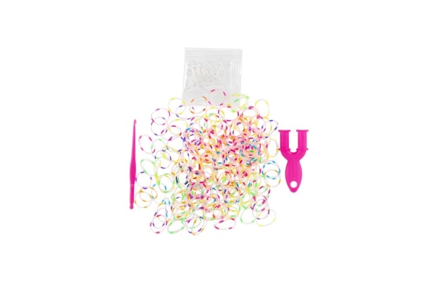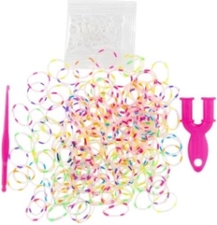 Incluye todo lo necesario para hacer pulseras: 200 gomas arcoíris, aguja/gancho y cierres.