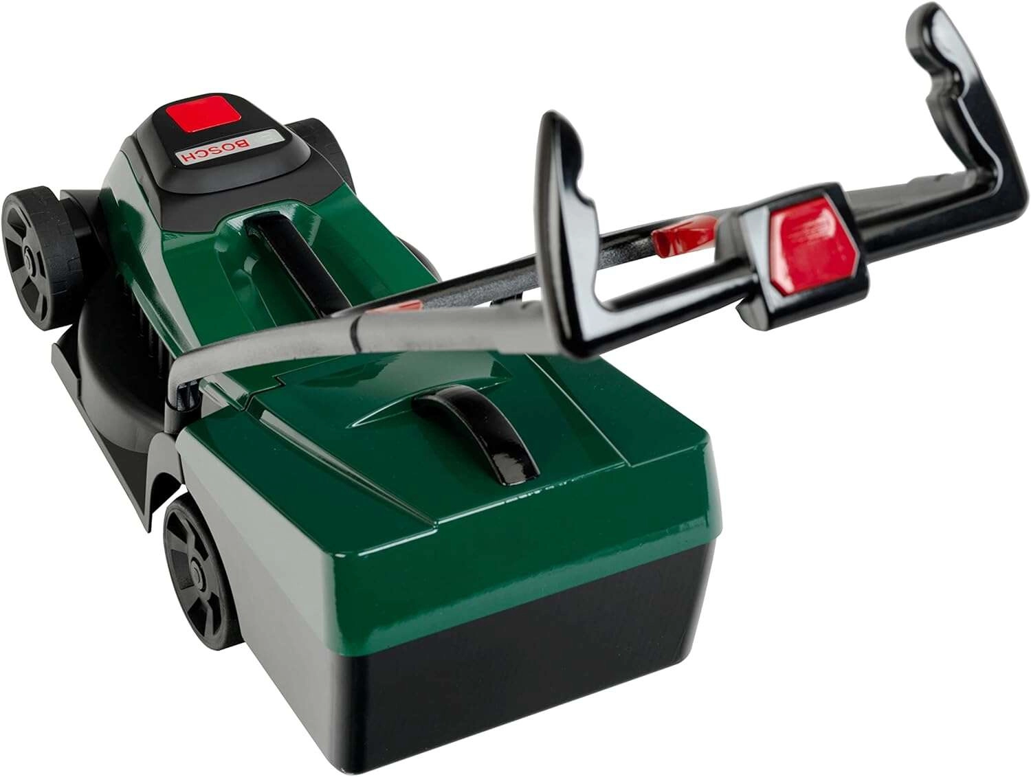 Este cortacésped infantil imita fielmente a una máquina real: tiene cuerpo verde oscuro, asa negra y ruedas móviles que ruedan suavemente sobre distintas superficies. El módulo de luz y sonido integrado y extraíble ilumina el logotipo BOSCH al pulsar el botón y reproduce sonidos realistas de motor. Incluso sin el módulo, al empujarlo emite un agradable “clic” mecánico y un retumbar rítmico de las ruedas.