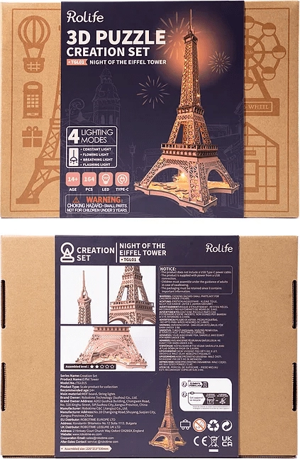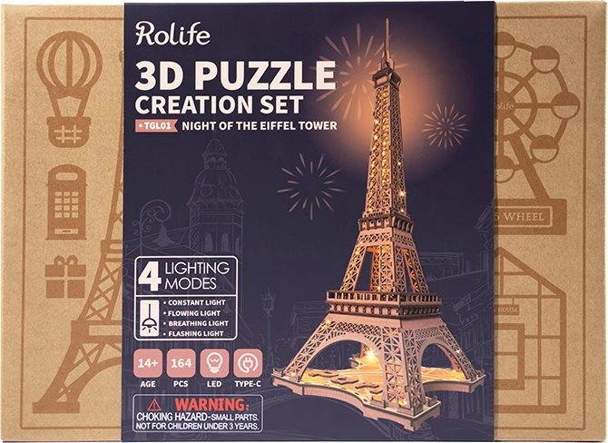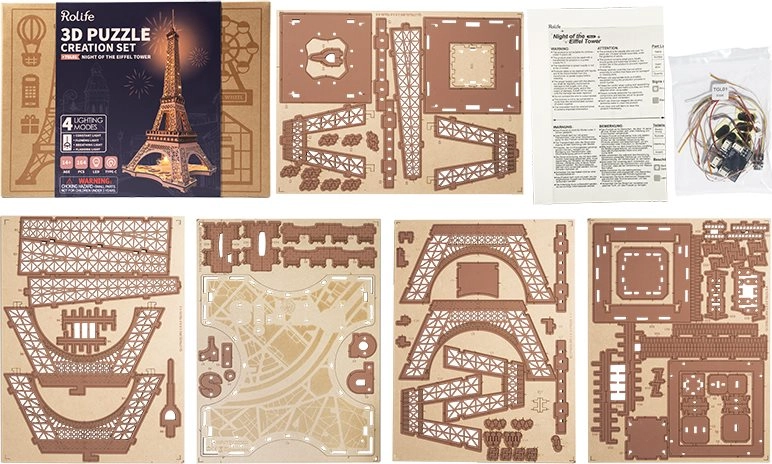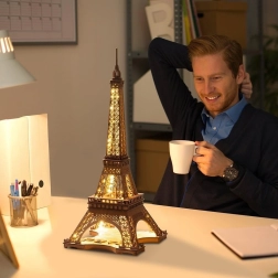 Descubre la magia de París en tu hogar. El modelo Rolife Noche de la Torre Eiffel captura fielmente la icónica arquitectura de celosía de 1889 y, gracias a los LED integrados, tras el montaje se convierte en una luz nocturna decorativa con una atmósfera suave y romántica. Las piezas de madera cortadas con láser encajan con precisión para un montaje sin complicaciones.
