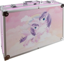 Descubre el completo set de pintura en un resistente maletín rosa con motivo de unicornios, ideal para niños y creadores principiantes. Dentro encontrarás todo para dibujar, colorear y pintar: rotuladores, lápices de colores, pasteles al óleo, acuarelas y pinturas acrílicas, además de prácticos accesorios. Gracias al organizador con compartimentos, los materiales permanecen ordenados y seguros. Las esquinas y cierres metálicos protegen el contenido durante el transporte.