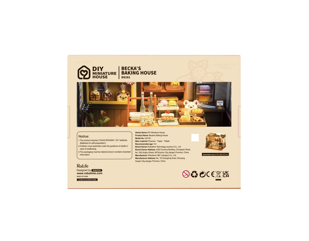 Réplica de panadería con elementos realistas, incluidas piezas de madera finamente talladas y decoraciones.