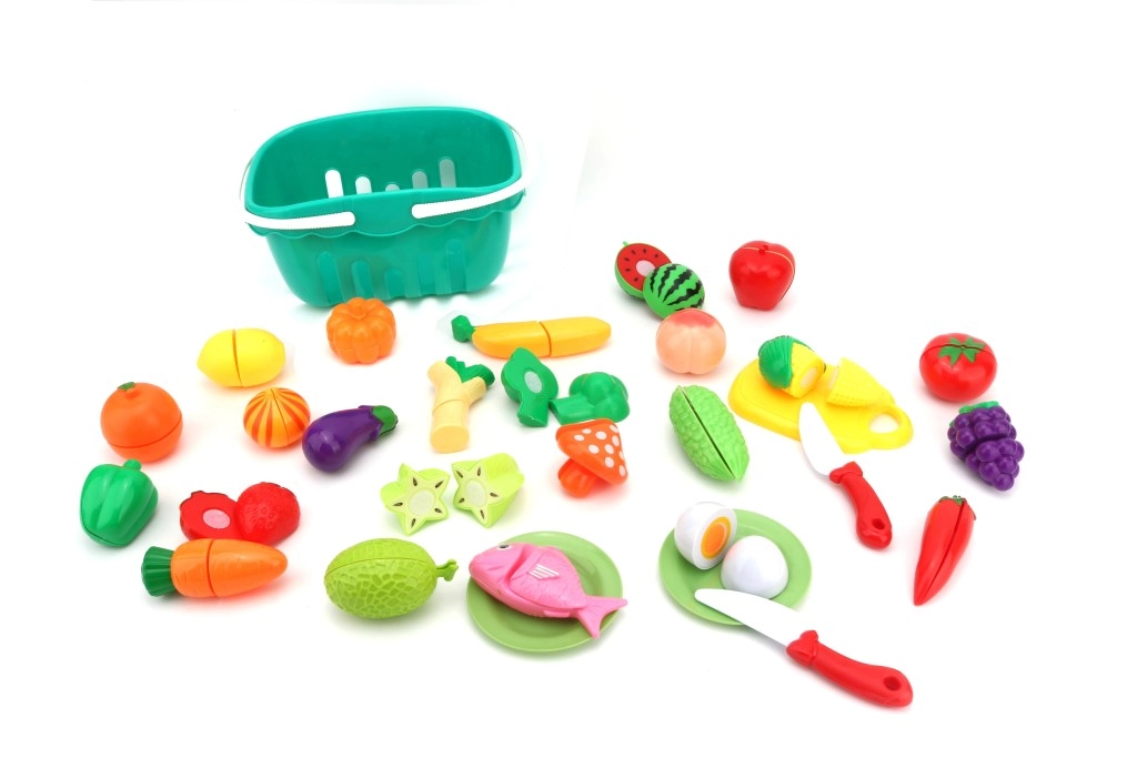 - Set de 30 piezas con frutas, verduras, pececito, platitos, tabla y cuchillos