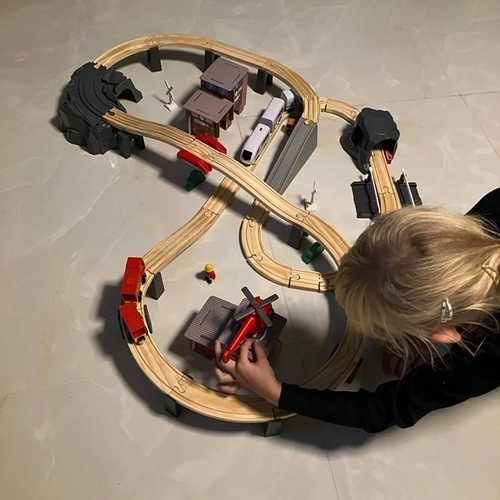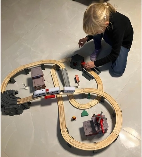 El set incluye 70 piezas elaboradas con precisión, con bordes suaves y pinturas seguras. Las piezas se combinan fácilmente gracias a imanes potentes que mantienen la unión incluso al transportar el convoy. La disposición variable permite diseñar nuevas vías y escenas en cada partida: ideal para el juego individual y en grupo.