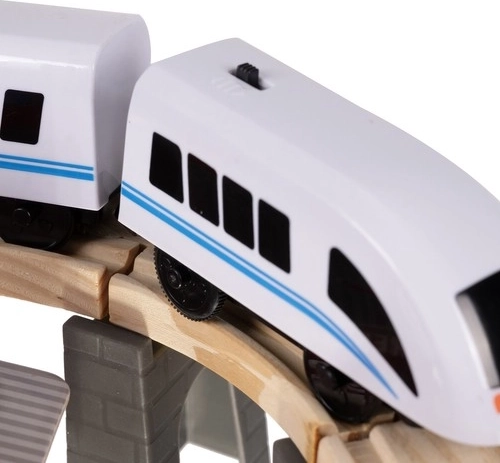 El tren de pasajeros, alimentado por 1× AA (no incluida), se conecta fácilmente mediante imanes firmes que mantienen el convoy incluso al levantarlo. Circulación fluida en tramos rectos, puentes y cruces.