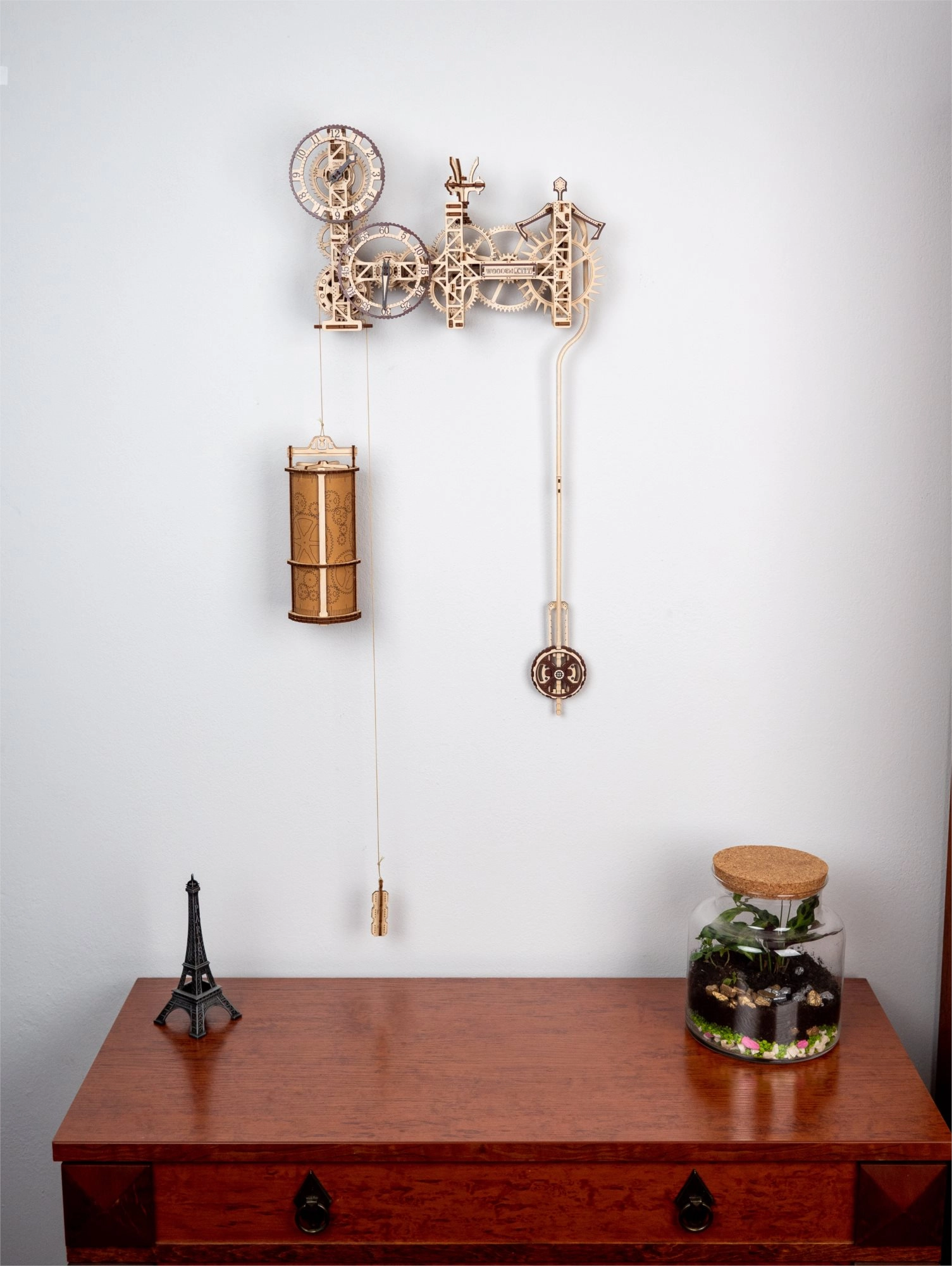 La estructura abierta con engranajes y palancas llama la atención a primera vista. Una decoración estética que además enseña mecánica.
