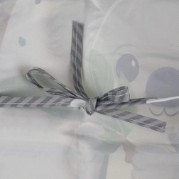 El amplio bolsillo frontal recoge migas y gotas. El cierre de velcro en el cuello y el lazo para atar en la espalda garantizan una sujeción segura.