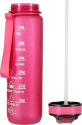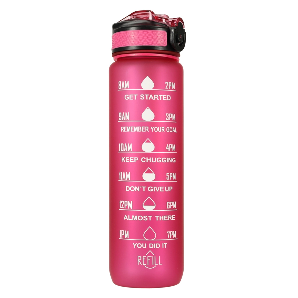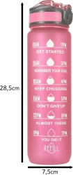 En el lateral encontrarás marcas horarias de la mañana a la noche con mensajes motivacionales que te guían a reponer líquidos regularmente. El volumen de 1 litro es perfecto para usar todo el día en casa, en la oficina y en el gimnasio.