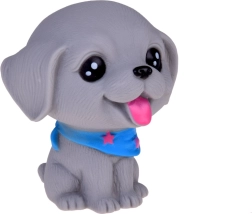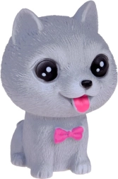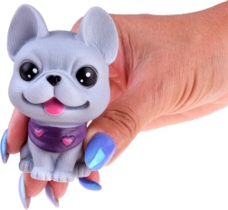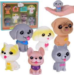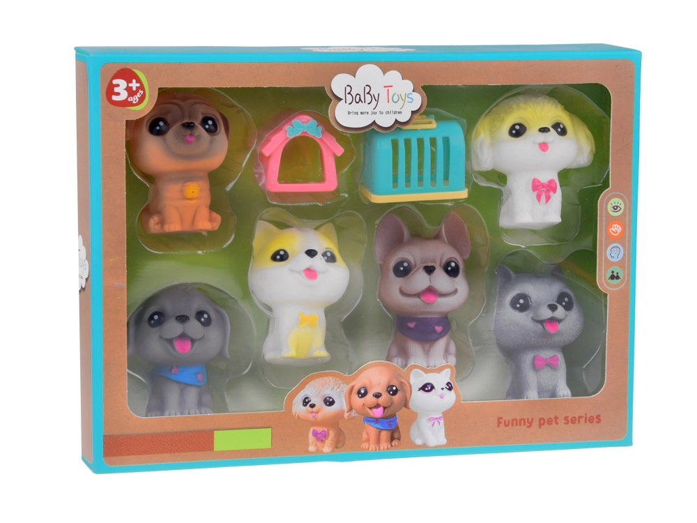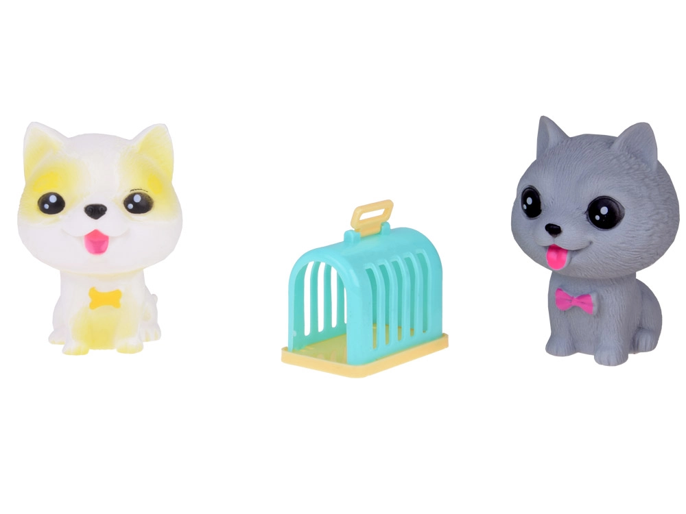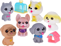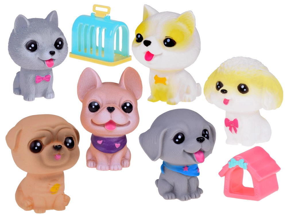Cada perro emite un divertido pitido al apretarlo y tiene un pequeño orificio en la parte inferior. El set incluye razas como bulldog, shiba inu, caniche, braco de Weimar, pug y chihuahua de pelo corto, cada uno con sus encantadores accesorios. Además, incluye una mini caseta y un transportín.