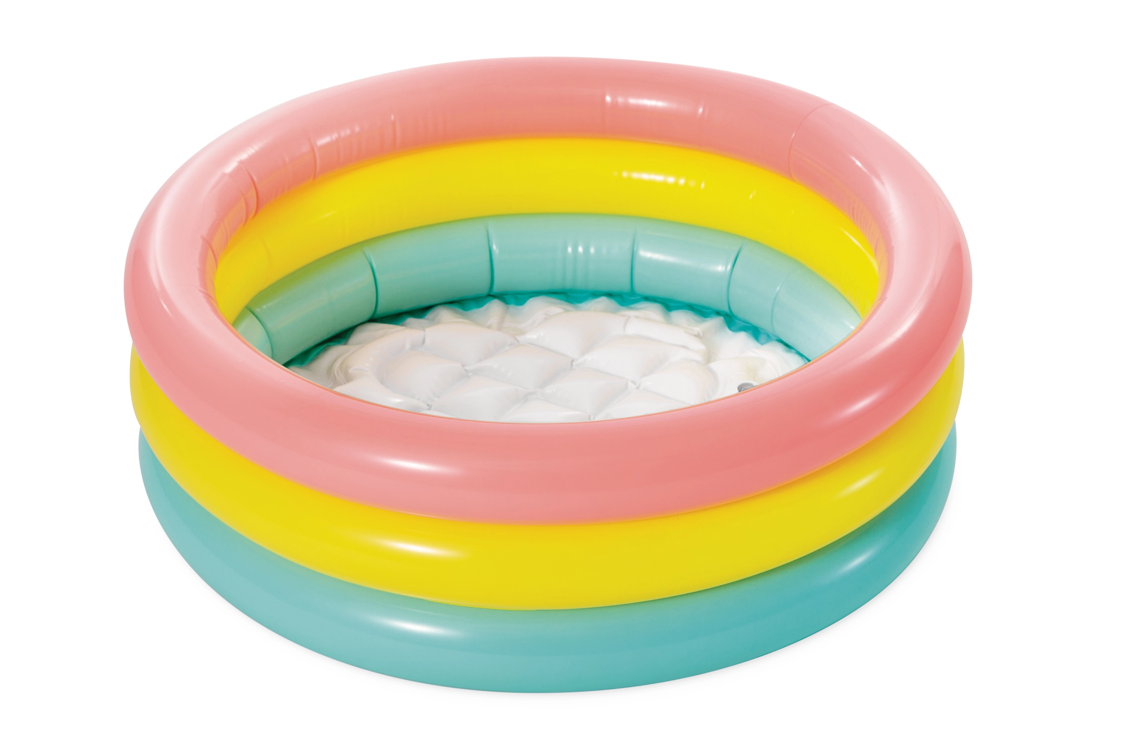 Tres anillos inflables en tonos llamativos rosa, amarillo y verde añaden atractivo a la piscina e invitan a los niños a jugar.