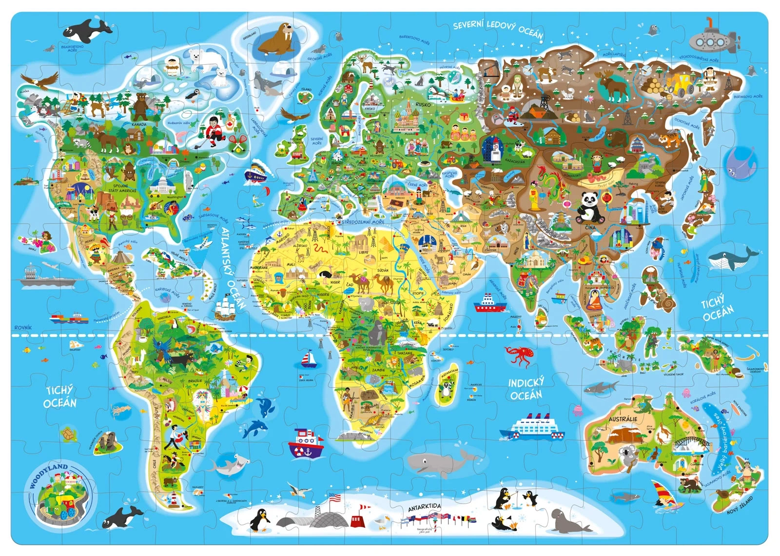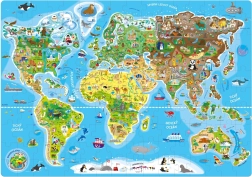 Descubre el mundo desde la comodidad de tu hogar con divertidos rompecabezas para niños y adultos. Rompecabezas geográfico con mapa del mundo que ofrece una vista general de los continentes, monumentos del mundo y animales por regiones. Excelente para divertirse y aprender, con ilustraciones de un artista checo.