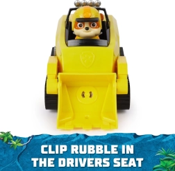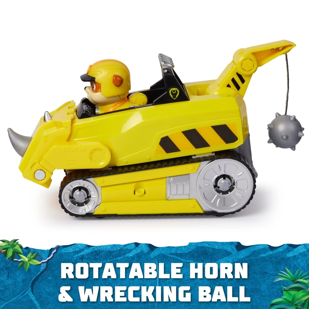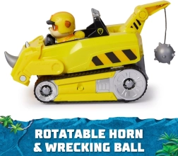 El compañero favorito Rubble llega con un vehículo robusto que ofrece una impresionante transformación al modo de rescate. Pulsa la placa de la Patrulla Canina en el capó y harás girar de inmediato la pala de la excavadora, que revela un cuerno de rinoceronte. Abre el compartimento trasero, eleva el brazo de la grúa y utiliza la bola de demolición para eliminar cualquier obstáculo.