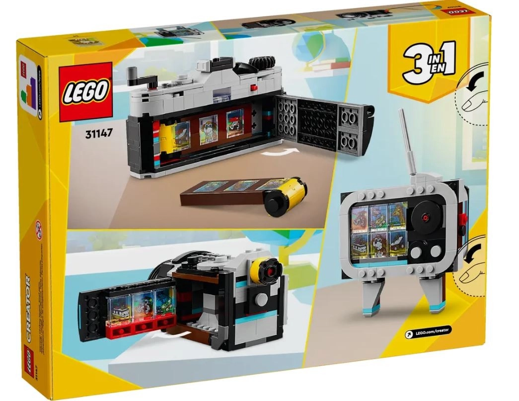 Los niños pueden construir y reconstruir hasta tres modelos icónicos diferentes —una cámara de fotos, una videocámara y un televisor— con un solo set de LEGO Creator.