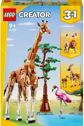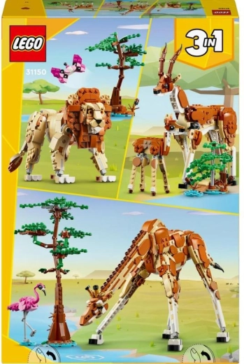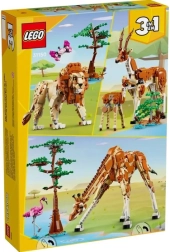 LEGO Creator 3 en 1 Animales salvajes del safari acerca a los niños al colorido mundo de la naturaleza africana. Con una sola caja de piezas, construirán una majestuosa jirafa de largo cuello con articulaciones móviles, acompañada de un flamenco y un árbol. Luego podrán reconstruir el modelo en dos antílopes (madre y cría) o en un imponente león, siempre con elementos complementarios para jugar a contar historias.