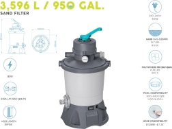 Gracias a su capacidad de 3596 l/h, la bomba es ideal para piscinas con un volumen de 1 100 a 18 100 litros. Para su funcionamiento requiere carga de arena (arena de sílice n.º 20, granulometría 0,45-0,85 mm, aproximadamente 8,5 kg) o bolas filtrantes de alto rendimiento Polysphere™ con un peso aproximado de 240 g.