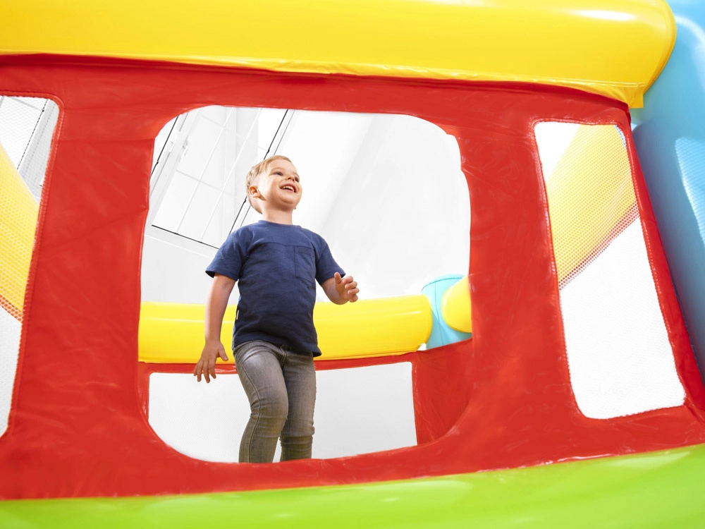 El material resistente de PVC está diseñado para un uso frecuente y un mantenimiento sencillo. La abertura de entrada permite subir y bajar cómodamente y las estacas de fijación mantienen la atracción en su sitio incluso durante un juego más movido en exterior.