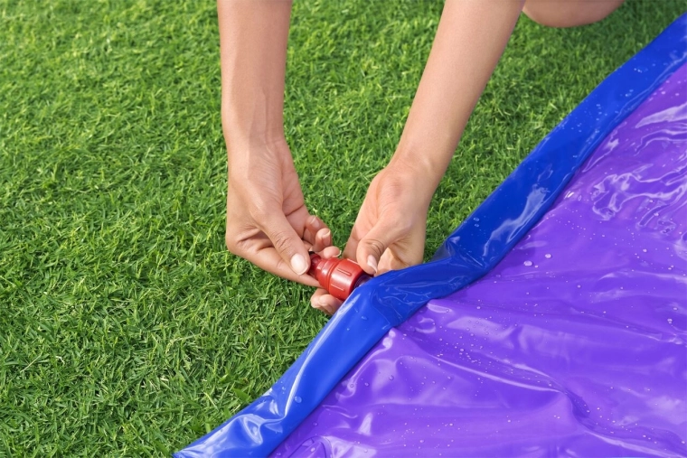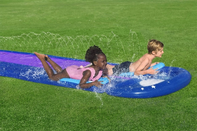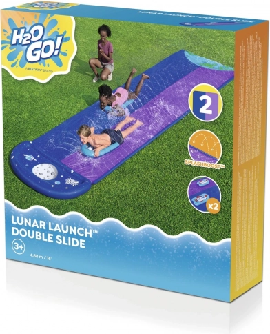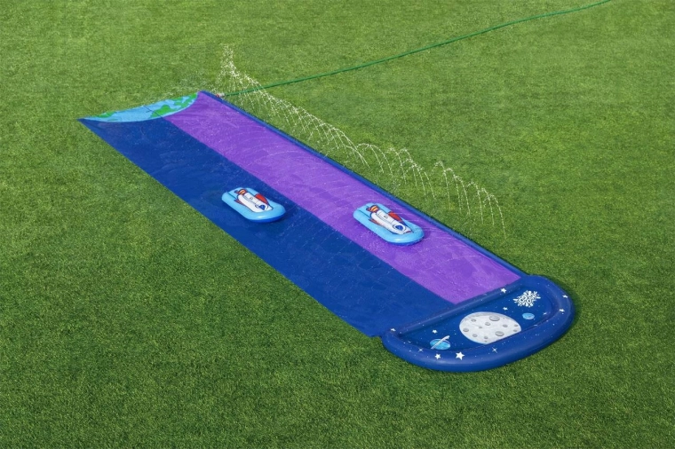 Este largo tobogán doble BESTWAY H2O GO! ofrece a los niños una diversión veraniega rápida, segura y refrescante directamente en tu jardín. Solo hay que desenrollarlo, fijarlo con piquetas y conectar la manguera del jardín: los aspersores laterales mantienen la superficie siempre mojada para un deslizamiento suave.