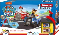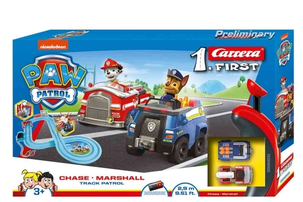Divertida autopista para los pilotos más pequeños: CARRERA First con temática de la Patrulla Canina ofrece una pista de 2,9 m, sistema analógico a pilas, dos coches CHASE y MARSHALL, estrechamiento para duelos emocionantes, puerta giratoria y mandos seguros para niños a partir de 3 años.