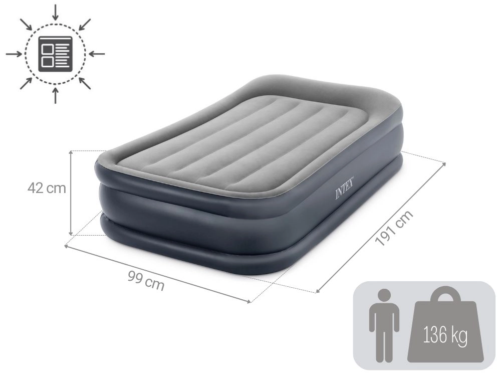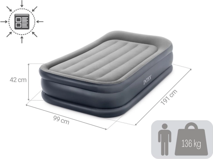 Cama inflable individual INTEX ofrece dimensiones de 191 × 99 × 42 cm, bomba eléctrica integrada para un inflado rápido, superficie de terciopelo aterciopelado para mayor comodidad y una construcción resistente Fiber‑Tech / Dura‑Beam para un soporte estable. Carga máxima 136 kg, incluye bolsa de transporte y parche de reparación.
