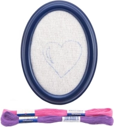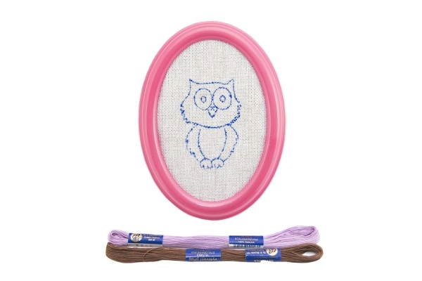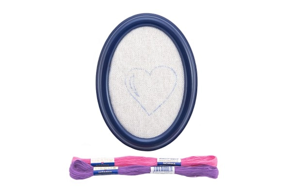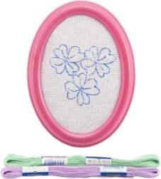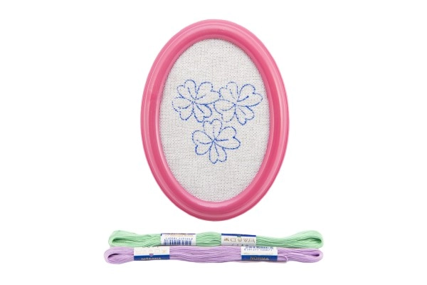 - Marco de plástico con tela tensada y diseño preimpreso, dos plantillas adicionales para bordar, hilos de algodón