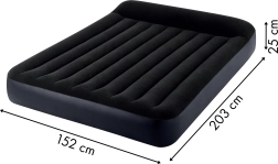 El colchón inflable de doble pared INTEX con dimensiones de 203 × 152 × 25 cm ofrece un descanso cómodo para 2 personas en casa o de viaje. Está fabricado en PVC resistente, su superficie es de agradable terciopelo impermeable y, gracias a la bomba eléctrica integrada, se infla en aproximadamente 250 segundos. La construcción estable con tecnología Dura-Beam Fiber garantiza una excelente sujeción de la columna, mientras que la almohada integrada aporta un plus de confort. La válvula práctica permite un desinflado rápido y fácil almacenamiento.