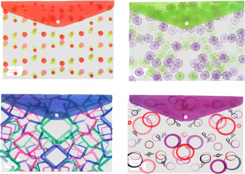 Práctica carpeta con cierre a presión de 35x25 cm, ideal para organizar y guardar documentos y papeles. Disponible en cuatro diseños diferentes.