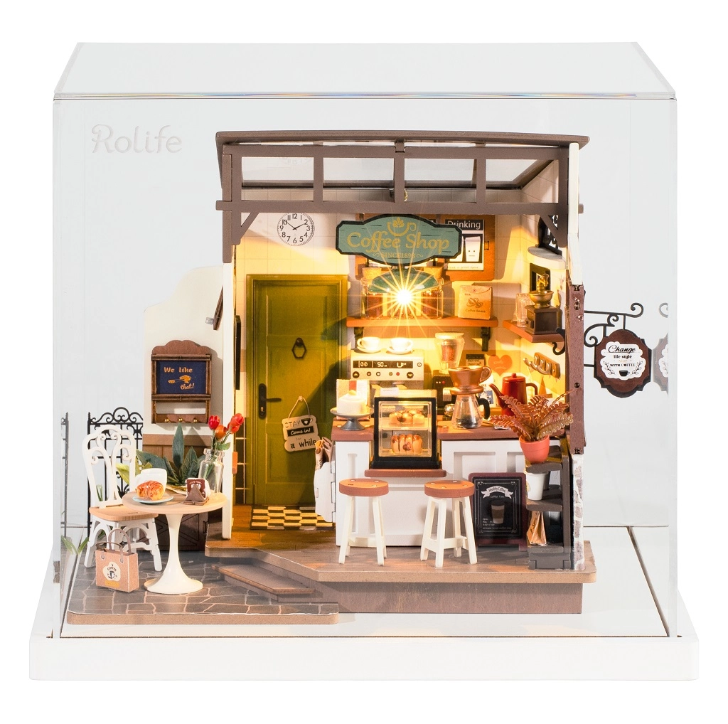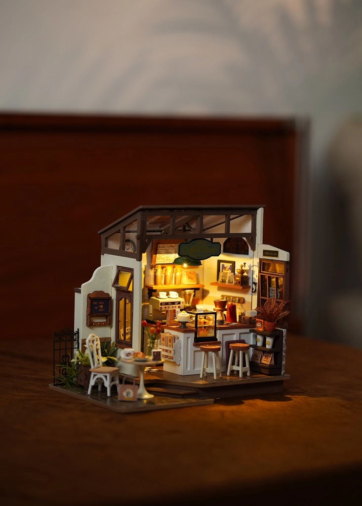 Entra en la atmósfera de una acogedora cafetería directamente en tu hogar. El rompecabezas 3D de madera RoboTime presenta un diorama detallado con barra, taburetes, plantas, rótulos y accesorios que en conjunto forman un todo armonioso. Gracias a su diseño bien pensado en madera de calidad, el modelo es robusto, preciso y, una vez montado, luce genial como decoración o pieza de colección.