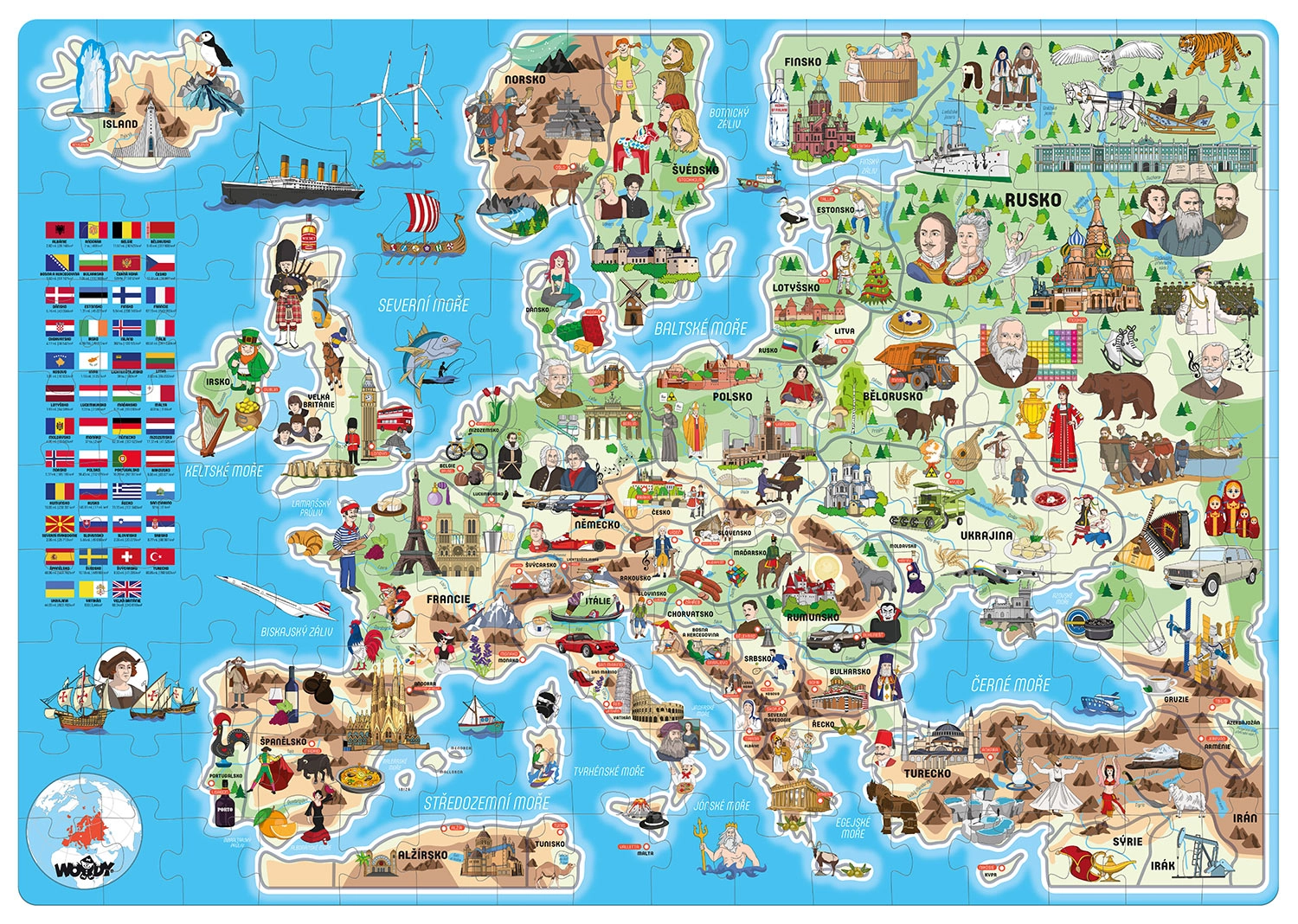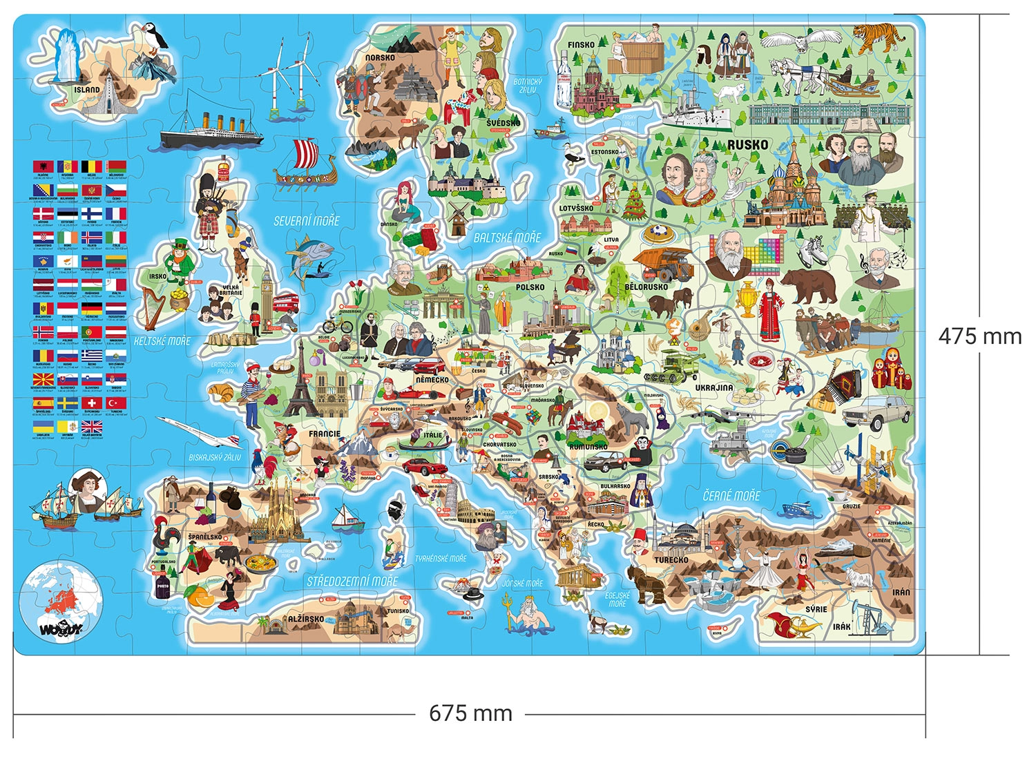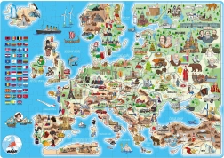 Descubre Europa de forma divertida con este puzzle infantil de 160 piezas. En el mapa encontrarás ilustraciones que caracterizan a cada país y sus banderas; todas las etiquetas están en checo. Montarlo fomenta el ojo observador, la destreza y la concentración, y gracias a las coloridas imágenes de animales, plantas y monumentos, desarrolla la imaginación y los conocimientos de geografía.