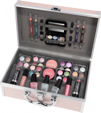 Elegante neceser de cosméticos rosa Eye-Catcher con espejo integrado que ofrece un equipo de maquillaje completo con un total de 42 piezas. Incluye 24 sombras de ojos, esmaltes de uñas incluido uno con purpurina, colorete, labiales y brillos, lápices de ojos y aplicadores y brocha. Dermatológicamente testado y conforme a las estrictas normas de la UE.