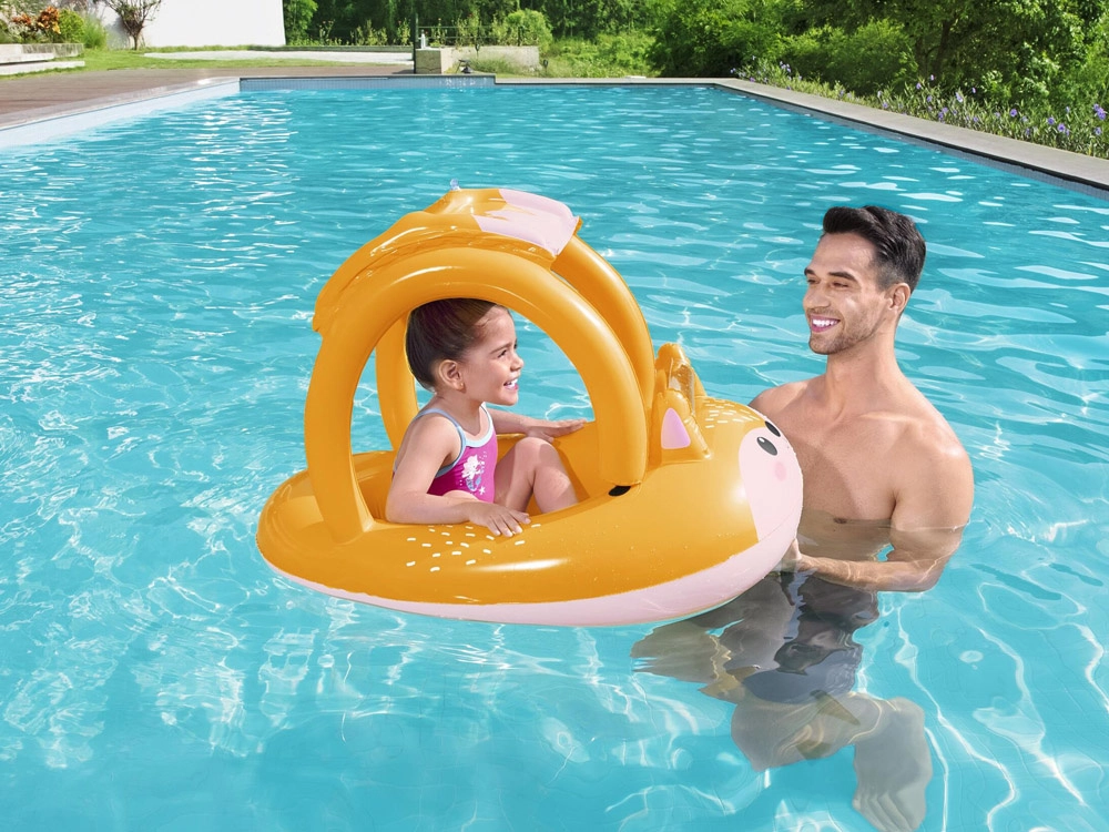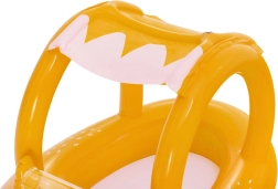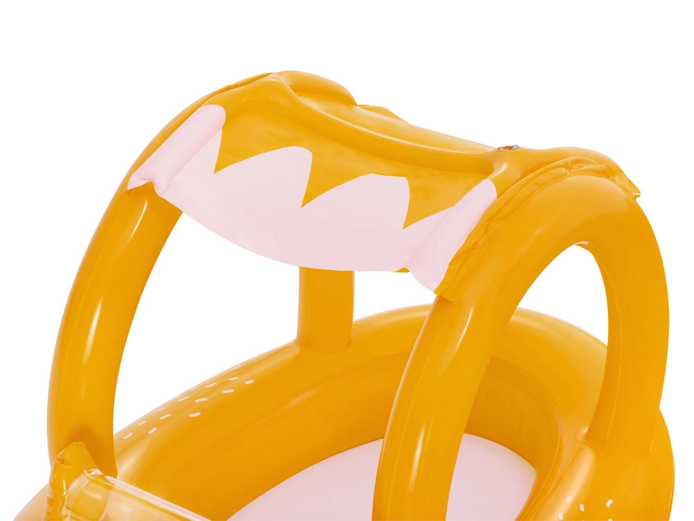 La barca está equipada con suelo inflable para máxima comodidad y una ventanilla transparente tipo peek-a-boo que permite a los niños mirar el mundo submarino. El techo desmontable ofrece protección solar.