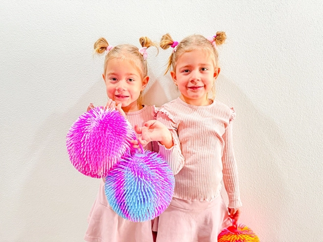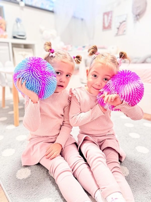 La pelota luminosa rosa‑blanca con flecos es una opción perfecta para la diversión activa en casa y en el jardín de infancia. Con cada movimiento se ilumina, motivando a los niños a seguir jugando y moviéndose. Las suaves “púas” ofrecen una agradable respuesta táctil y estimulan el desarrollo sensorial.