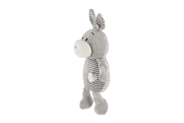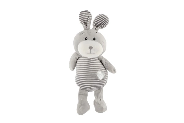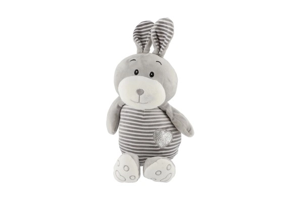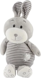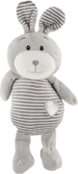 Este conejito gris a rayas con detalles adorables y un corazón en la barriguita brinda a los niños una sensación de seguridad y confort. Está hecho de un material agradable y suave que invita a abrazarlo y es delicado incluso para los bebés más pequeños.