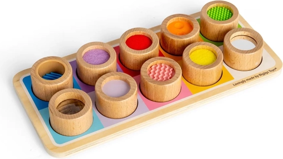 Este asombroso tablero sensorial es la manera perfecta de presentar a los niños diversas texturas y colores. Incluye una base de madera con orificios de colores y once piezas encajables, cada una con un acabado superficial único, desde silicona acanalada hasta fieltro suave. Este juguete no solo ayuda a distinguir diferentes texturas, sino que también favorece la coordinación mano-ojo.