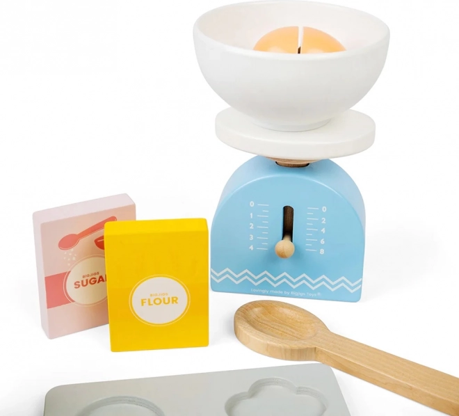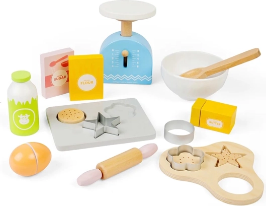 Con este juego infantil de repostería de madera podrás ofrecer a los niños horas de diversión y, al mismo tiempo, estimular su imaginación. El set incluye una bandeja de horno de madera, báscula, cortadores, rodillo, cuenco, mantequilla, huevos, harina, azúcar y leche. La seguridad en la cocina se aprende de forma lúdica y entretenida.