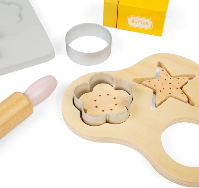 El set proporciona todo lo necesario para el pequeño pastelero: bandeja, báscula, cuenco, rodillo, cortadores y más.