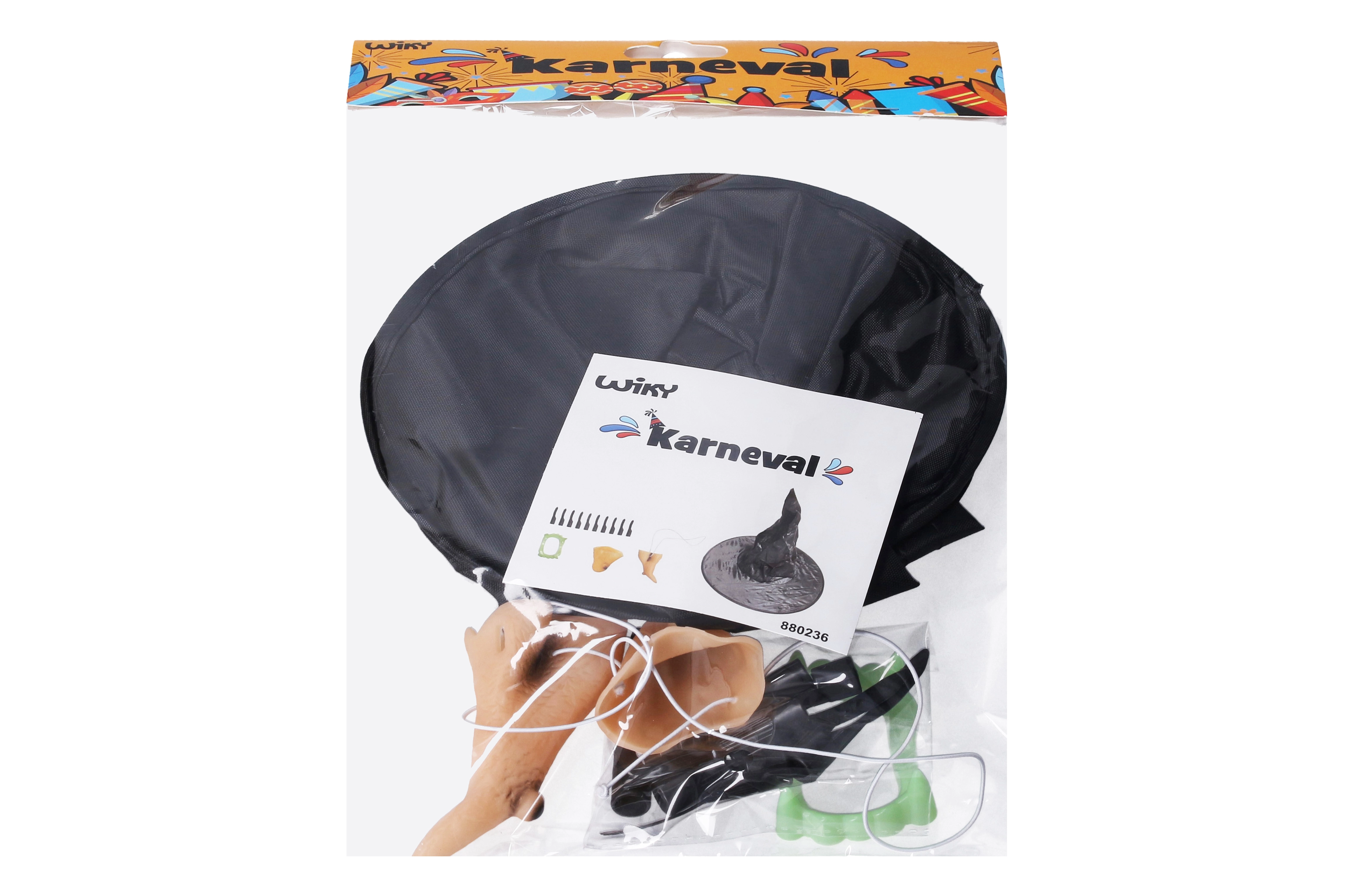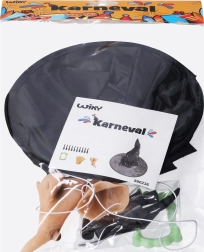 Completo set de bruja para cualquier fiesta, carnaval y Halloween. Incluye un sombrero grande, barbilla y nariz con goma elástica, 10 dedos postizos con uñas y dientes, para crear fácilmente un auténtico look de bruja en pocos minutos.
