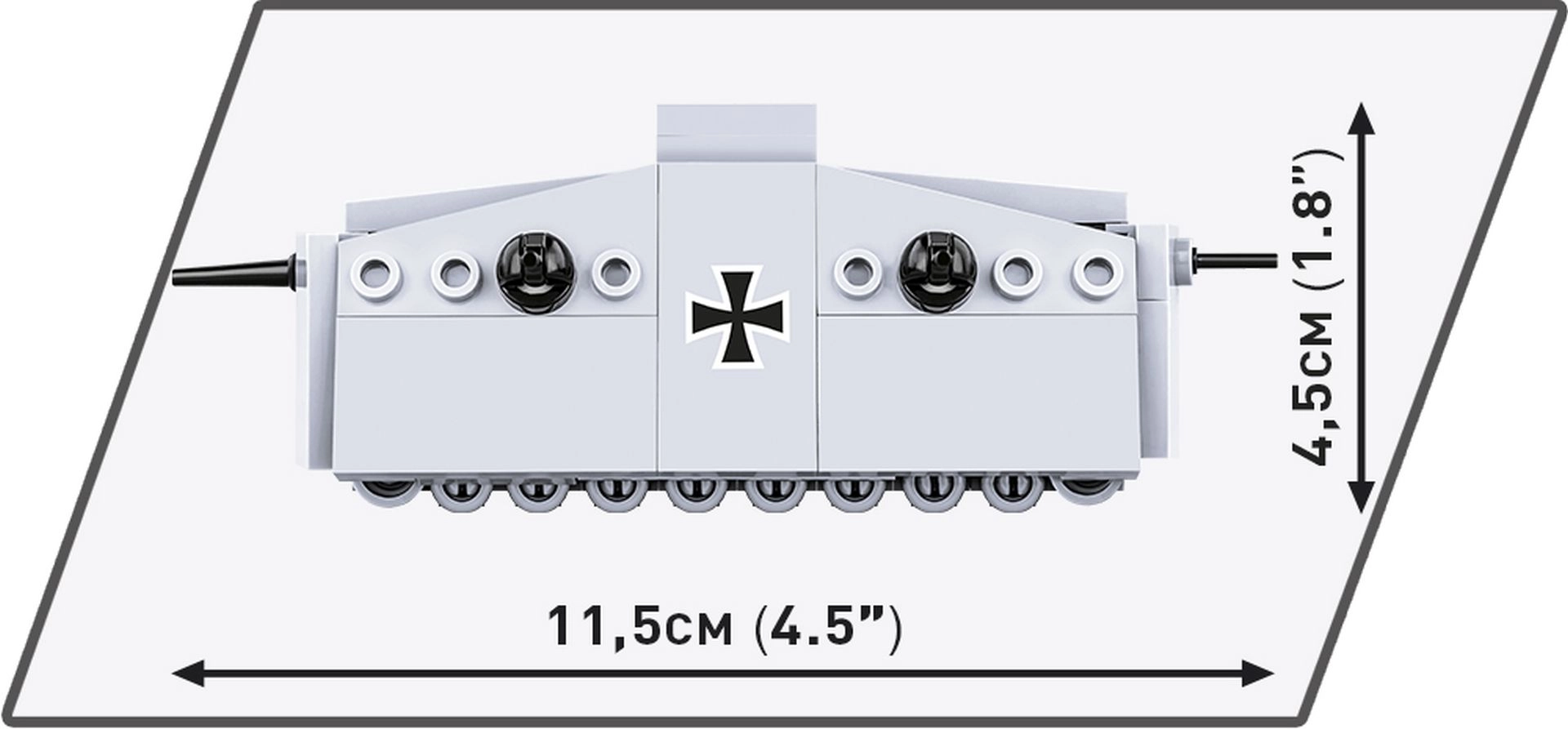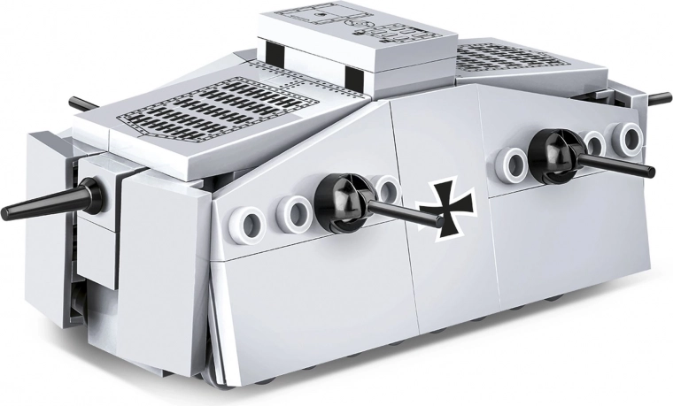 El Sturmpanzerwagen A7V fue el primer tanque alemán desplegado al final de la Primera Guerra Mundial. Este icónico blindado, con una tripulación de hasta 18 soldados, llevaba un cañón Nordfeld de 57 mm y seis ametralladoras MG 08. El modelo de COBI a escala 1:72, con una longitud de aprox. 11,5 cm, mantiene los rasgos típicos del original y destaca por los precisos estampados de cruces, rejillas y escotillas.