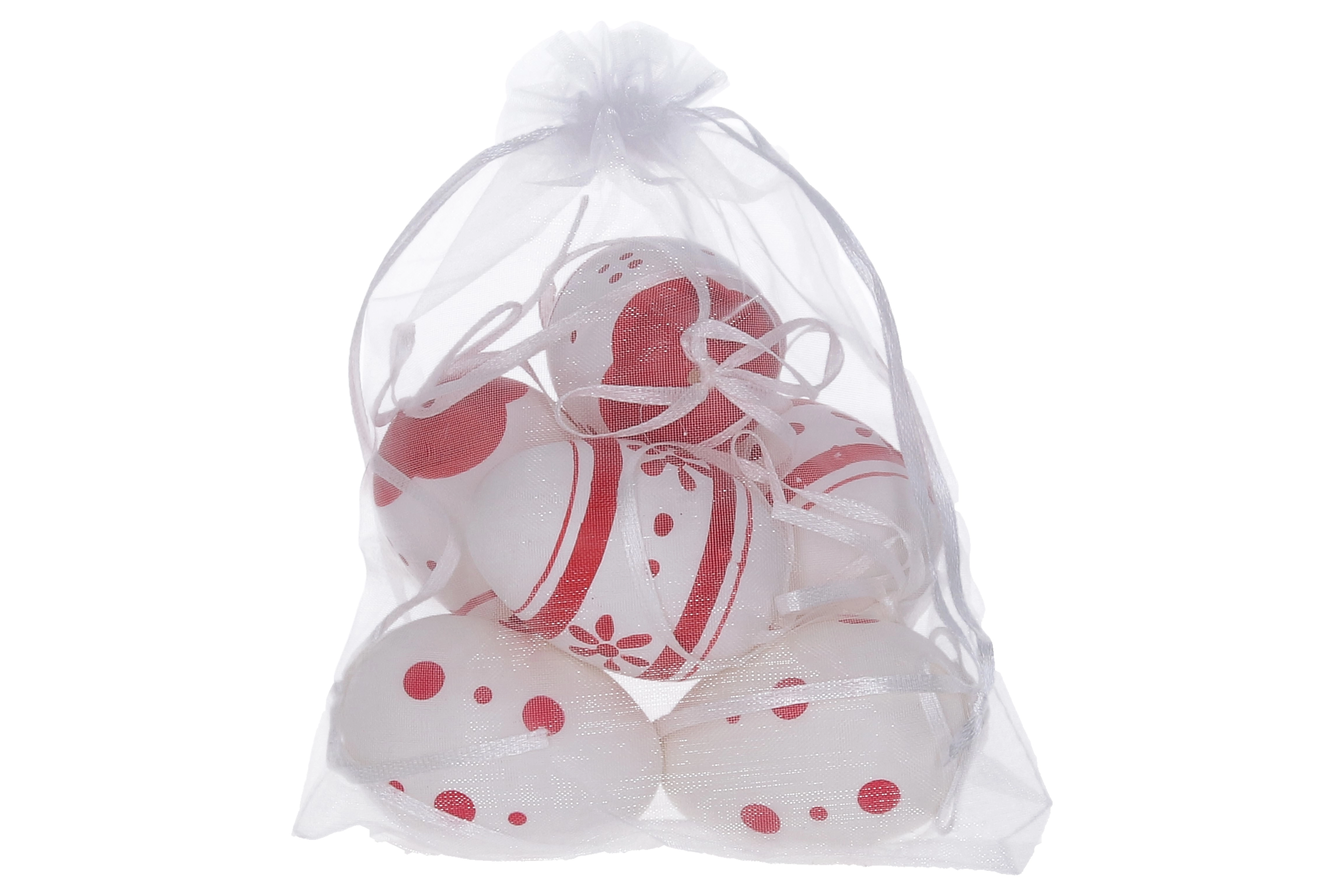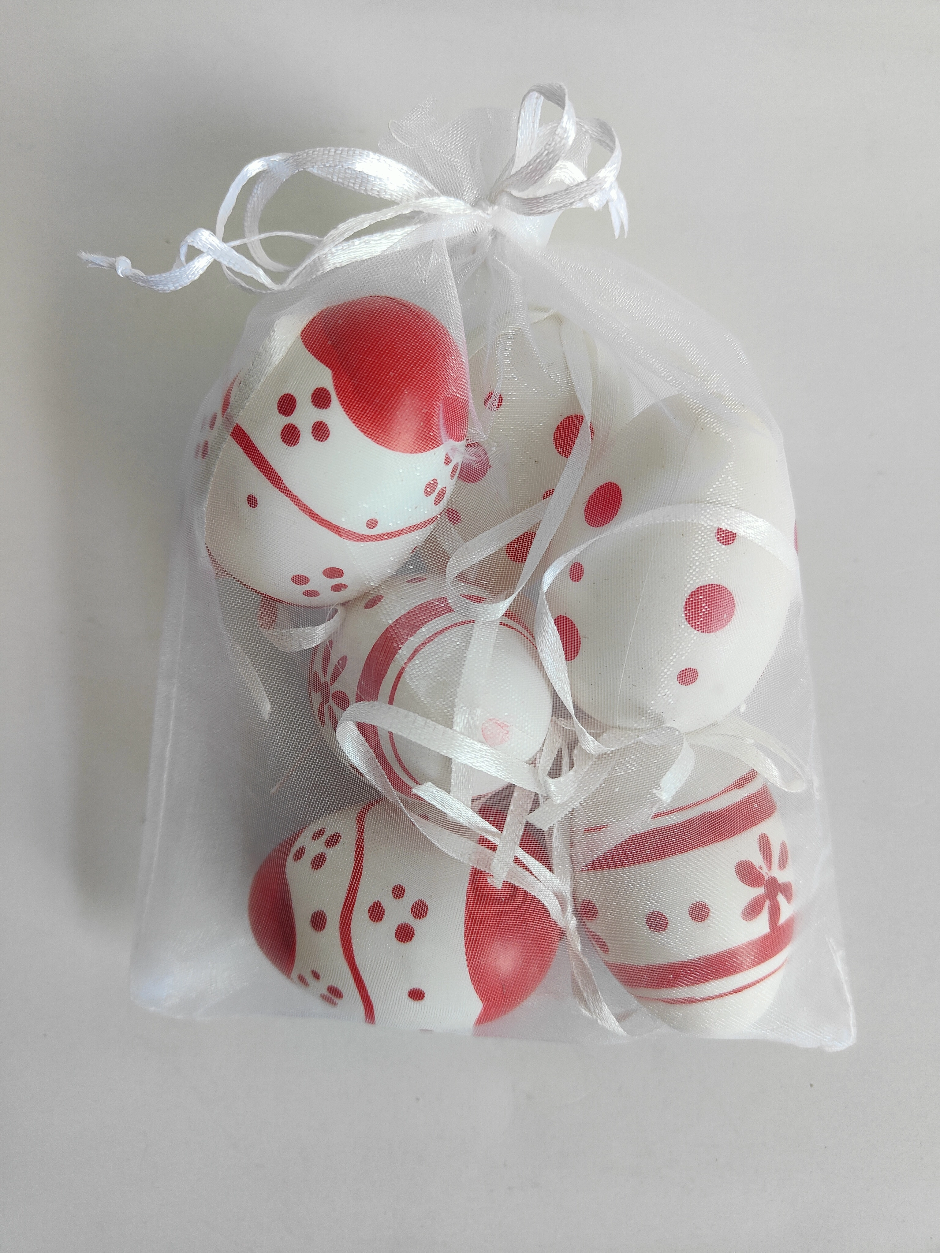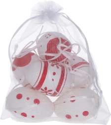 Huevos decorativos de plástico pintados de 6 cm, ideales para tus decoraciones festivas. Recibirás 6 unidades en una elegante bolsita de organza.